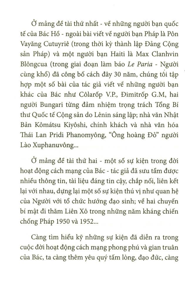 Ở mảng đề tài thứ nhất - về những người bạn quốc tế của Bác Hồ - ngoài bài viết về người bạn Pháp là Pôn Vayăng Cutuyriê (trong thời kỳ thành lập Đảng Cộng sản Pháp) và một người bạn Haiti là Max Clanhvin Blôngcua (trong giai đoạn làm báo Le Paria - Người cùng khổ) đã công bố cách đây 30 năm, chúng tôi tập hợp một số bài của tác giả viết về những người bạn khác của Bác như Côlarốp V.P., Đimitrốp G.M, hai người Bungari từng đảm nhiệm trọng trách Tổng Bí thư Quốc tế Cộng sản do Lênin sáng lập; nhà văn Nhật Bản Kômátsu Kiyôshi, chính khách và nhà văn hóa Thái Lan Pridi Phanomyông, “Ông hoàng Đỏ” người Lào Xuphanuvô