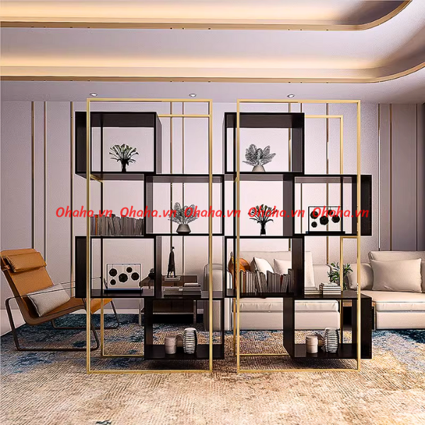 Kệ trang trí phòng khách thiết kế sang trọng Ohaha - KTT012 được kết hợp giữa hai chất liệu chủ đạo là gỗ MDF chống ẩm và khung sắt, giúp bạn không phải tốn quá nhiều thời gian, công sức và chi phí để trang trí lại căn phòng của mình. Mẫu thiết kế với kiểu dáng hiện đại dành cho phòng làm việc, phòng khách hay văn phòng có diện tích đa dạng để bạn có thể trang trí những khu vực đó một cách gọn gàng đẹp mắt và vô cùng tiện nghi. Đặc biệt, kệ có thể dùng như vách ngăn giữa các không gian chức năng khác nhau của văn phòng, vừa thông thoáng, vừa đẹp mắt.