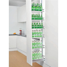 Giá đa năng để giao thớt, chai lọ, gia vị Chất liệu: Inox 304 dạng nan tròn Phiên bản bắt cánh ngăn kéo và mở cánh Ray âm giảm chấn Angas Độ rộng cánh: 300mm