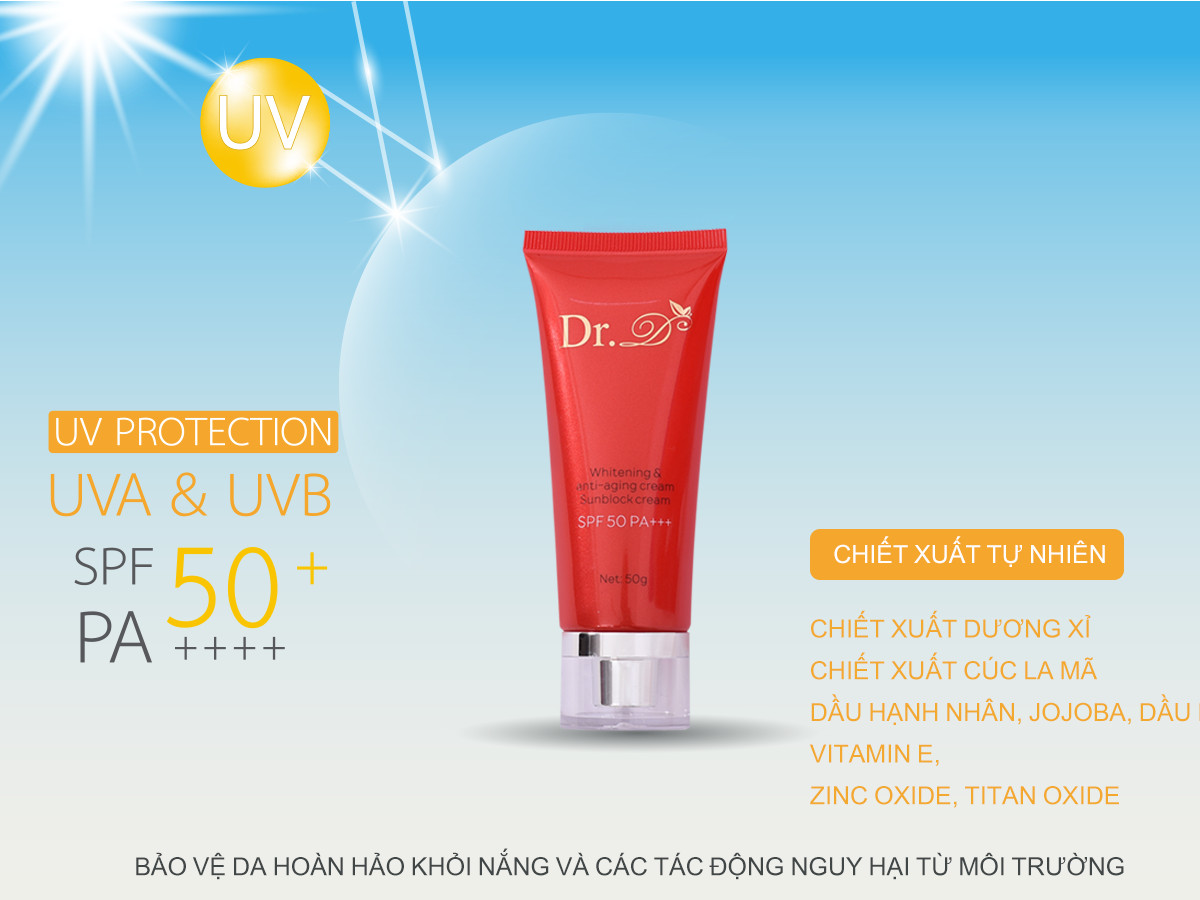 Kem chống nắng Dr.D chứa Oxit Kẽm và Oxit Titan - 2 thành phần chống tia UVA cực kỳ hiệu quả. Bên cạnh đó, chiết xuất Dương xỉ có trong sản phẩm cũng được nhiều nghiên cứu công nhận về hiệu quả chống nắng cao.
