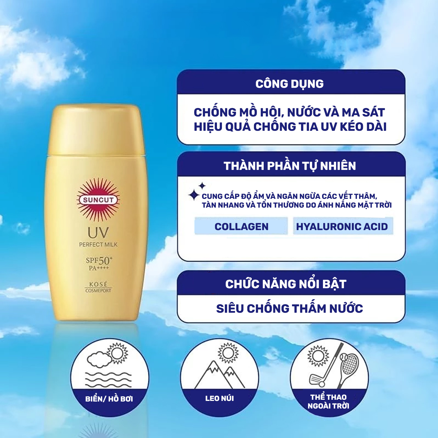 Công Dụng Kem Chống Nắng Siêu Chống Thấm Nước Kose Suncut UV Perfect Essence Super Water Proof SPF50+ PA++++: Sản phẩm chống nắng giúp bảo vệ da dưới tác động của ánh nắng mặt trời, giúp làm trắng da, dưỡng ẩm cho da, cho làn da tươi sáng, khỏe đẹp.