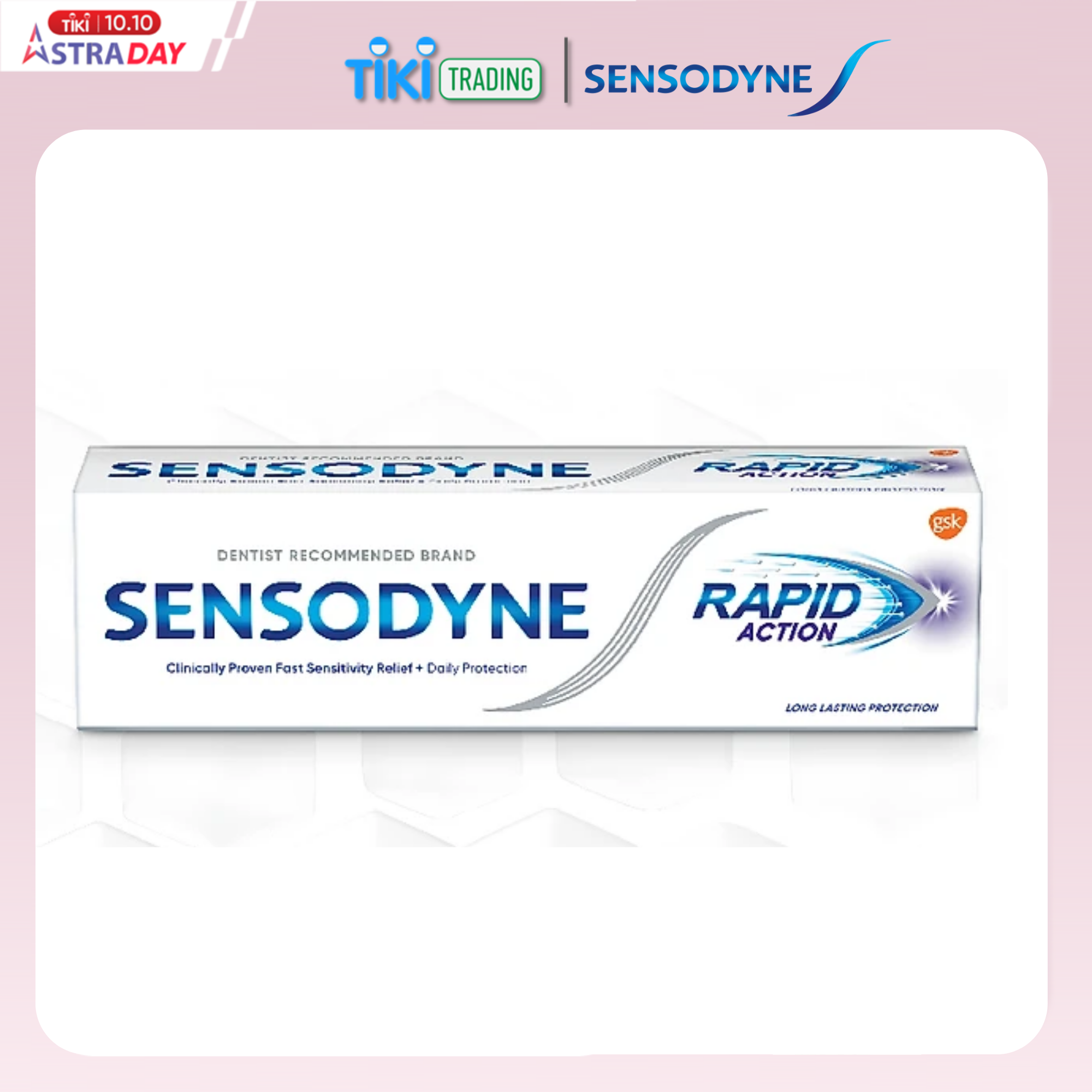 Kem đánh răng Sensodyne Rapid Action tác động nhanh chóng để tạo ra 1 chất phủ trên bề mặt men răng và trong các ống ngà răng – nhanh chóng bịt kín ống ngà bị lộ, giúp ngăn chặn các tác nhân gây kích thích dây thần kinh trong răng, từ đó giảm nhanh ê buốt răng Giúp giảm ê buốt răng & ngăn ngừa ê buốt quay trở lại (khi sử dụng ít nhất 2 lần nhưng không quá 3 lần/ngày). Giúp làm sạch răng miệng, Ngừa sâu răng. Mang lại cảm giác sạch sẽ và thơm mát. Thông tin sản phẩm Thành phần: Glycerin, PEG-8, Hydrated Silica, Pentasodium Triphosphate, Aroma, Sodium Lauryl Sulfate, Titanium Dioxide, Carbomer, Sodium Saccharin, Stannous Fluoride, Cocamidopropyl Betaine, Sodium Fluoride Cách dùng: