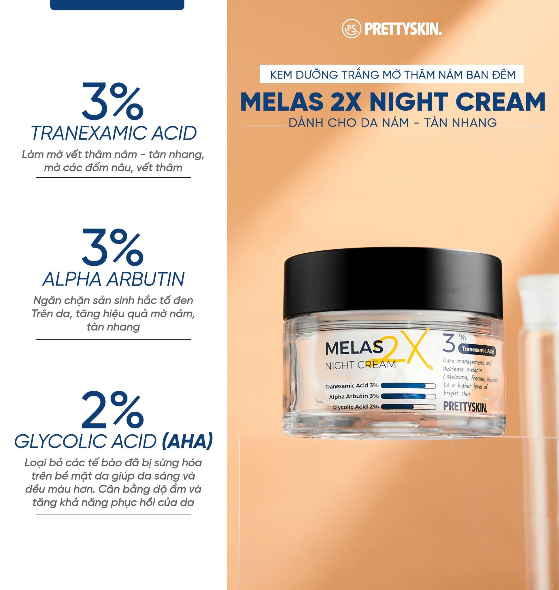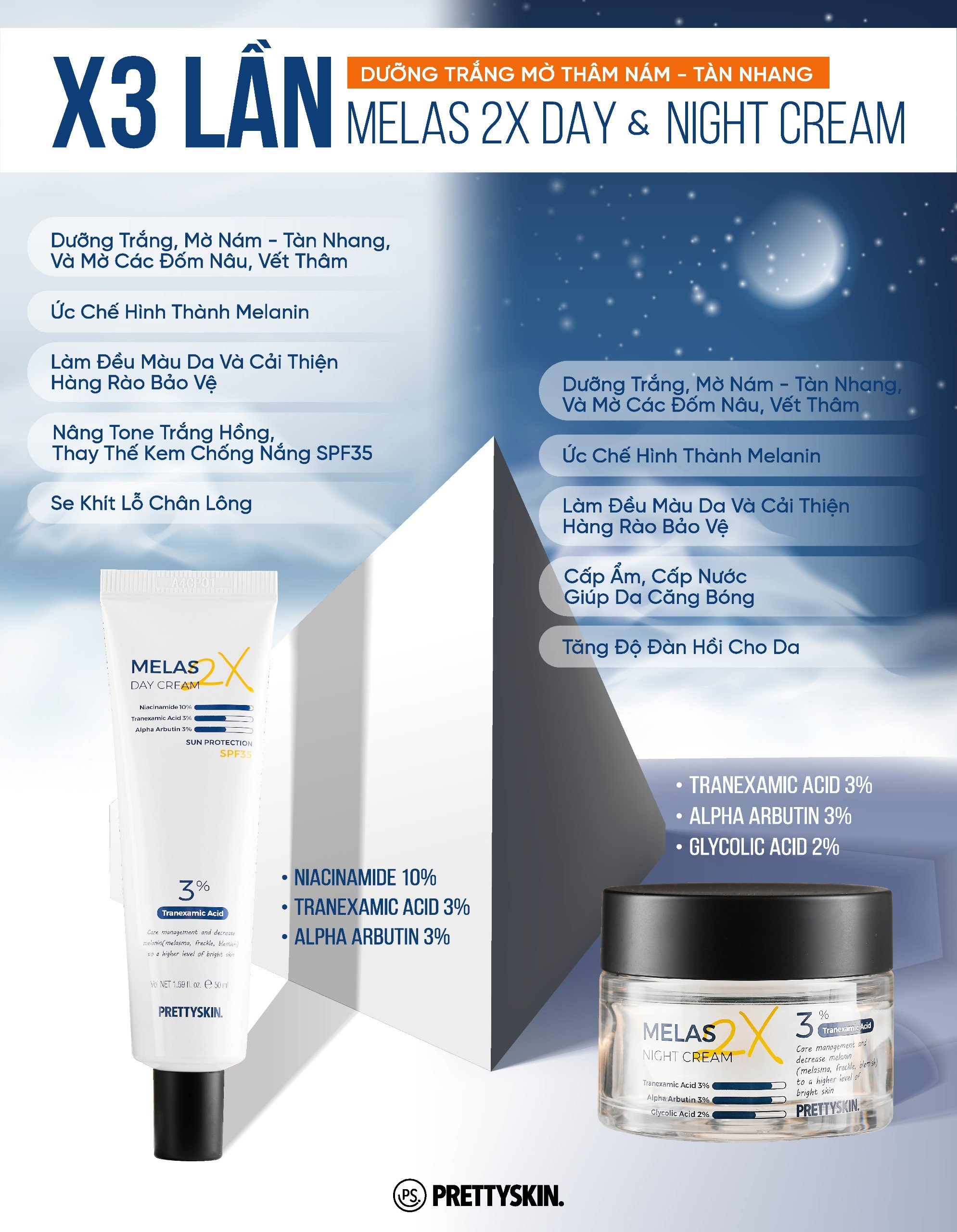 Sự kết hợp của 3% cùng với 3% là điểm nhấn ấn tượng có trong bộ đôi kem dưỡng ngày đêm Melas 2X mới nhà Prettyskin mang lại hiệu quả làm sáng da và làm mờ các vết thâm nám.