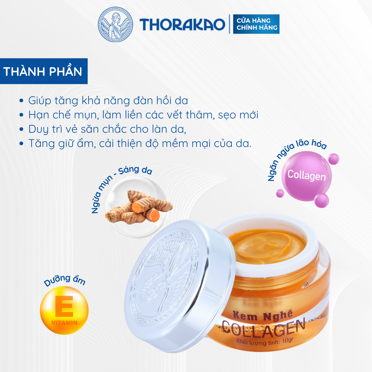 KEM NGHỆ COLLAGEN THORAKAO 10G Giúp Căng Bóng Giảm Nếp Năng Tăng Độ Đàn Hồi Cho Da Kem nghệ Collagen Thorakao 10g có thành phần chiết xuất từ củ nghệ tươi và dưỡng chất