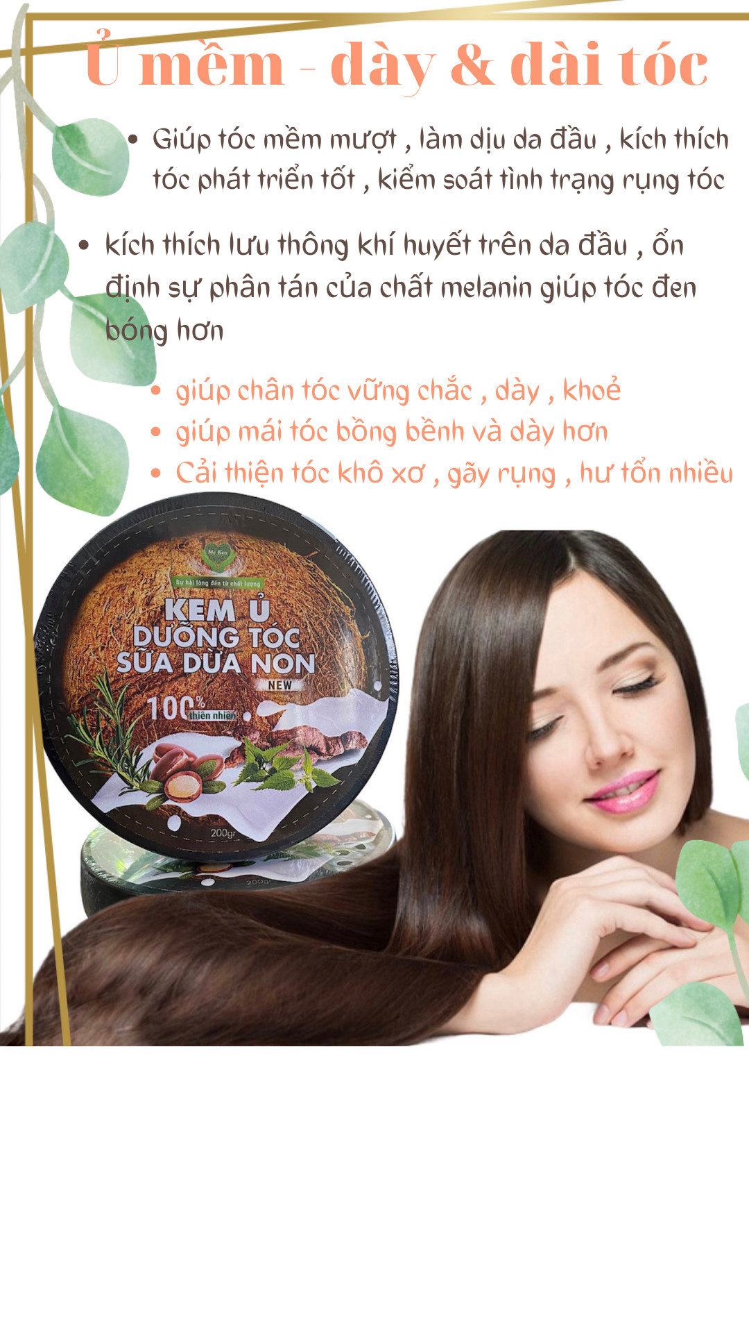 Mua tại TiktokKEM Ủ TÓC SỮA DỪA NON MẸ KEN 200ml Thành phần: Tinh chất sữa bò tươi , tinh dầu dừa , chiết xuất hà thủ ô đỏ , dầu Argan , tinh dầu bưởi , bơ hạt mỡ , tầm ma , bồ công anh , dầu bơ , chiết xuất mồng tơi , chiết xuất nha đam , hạt lanh , chiết xuất hương thảo Công Dụng :