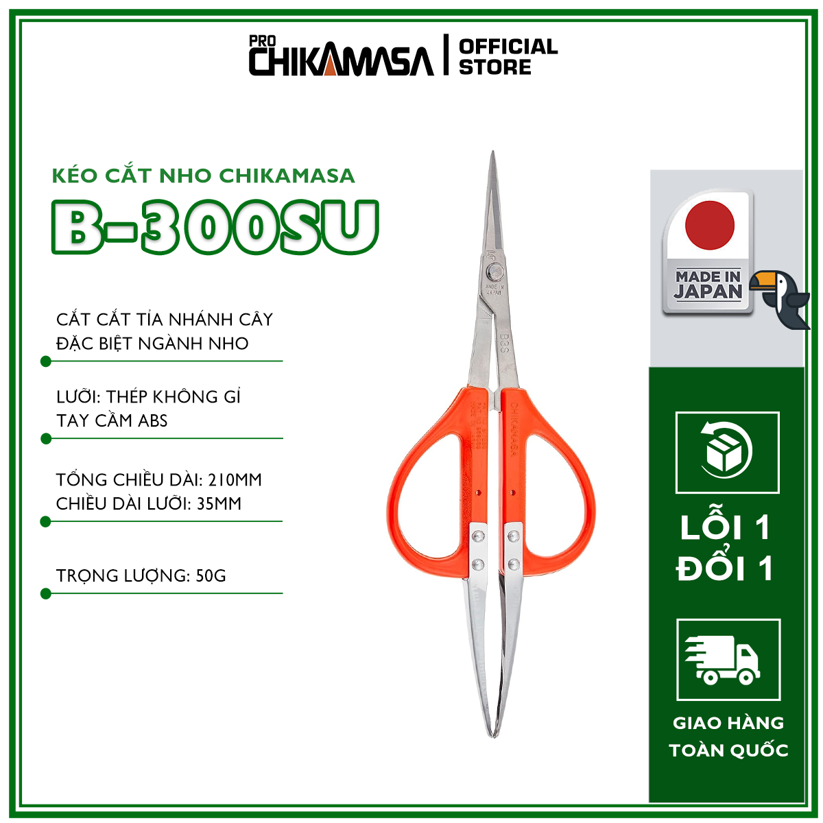 - Nét đẹp và độ tỉ mỉ của kéo cắt nho Nhật Bản Kéo cắt nho Chikamasa là bộ sưu tập thú vị cho chị em thích những chiếc kéo xinh xắn và có độ bén cao. Chikamasa B-300SU là loại kéo dài nhỏ được làm bằng thép không gỉ, lưỡi cắt đi qua nhau như kéo cắt giấy quen thuộc. Mặt cắt phẳng phiu được mài bằng kỹ thuật tiên tiến cho độ sắc ấn tượng, cắt bén ngọt, sạch sẽ cành hoa, nhánh lá và hoa trái. Tay cầm ABS trên dưới làm rộng và đều nhau xỏ vừa các ngón tay và giúp chị em giữ kéo ngay ngắn . Được chế tạo theo kỹ thuật người Nhật, kéo cắt nho Chikamasa thống nhất và khớp tuyệt đối giữa tay cầm và lưỡi cắt. Khi cầm nắm không có cảm giác lỏng lẻo hay tiếng rít ở chỗ tiếp xúc, nhờ đó thao tác cắt tỉa rất êm ái nhẹ nhàng. Lưỡi cắt chống gỉ sét tuyệt đối cùng tay cầm cứng cáp, vừa vặn với đôi bàn tay xinh xắn bé nhỏ của chị em phụ nữ. Ngoài ra dòng sản phẩm này đặc biệt trang bị thêm cặp Nhíp giúp bạn xử lý nho hỏng bên trong chùm nho được dễ dàng mà không làm tổn hại đến trái nho bên cạnh.