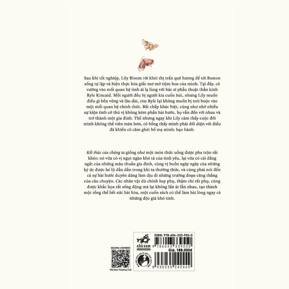 Sau khi tốt nghiệp, Lily Bloom rời khỏi thị trấn quê hương để tới Boston sống tự lập và hiện thực hóa giấc mơ mở tiệm hoa của mình. Tại đây, cô vướng vào mối quan hệ tình ái lạ lùng với bác sĩ phẫu thuật thần kinh Ryle Kincaid. Mỗi người đều bị người kia cuốn hút, nhưng Lily muốn điều gì bền vững dài lâu, còn Ryle lại không muốn bị trói buộc vào một mối quan hệ chính thức. Bất chấp khác biệt, cũng như nhờ nhiều sự kiện tình cờ thú vị không kém phần hài hước, họ vẫn đến với nhau và trở thành một gia đình. Thế nhưng ngay khi Lily cảm thấy cuộc đời mình không thể viên mãn hơn, cô bỗng thấy mình phải đối diện với điều đã khiến cô căm ghét bố mẹ mình: bạo hành. Kết thúc của chúng ta giống như món đồ uống được pha trộn rất khéo: vừa có vị ngọt ngào khó tả của tình yêu, lại có những cái đắng ngắt của cuộc sống gia đình, cùng vị buồn ngây ngây của những kí ức được hé lộ dần dần trong khi thưởng thức, và cũng phải nói đến cả sự hài hước duyên dáng làm dịu đi những trường đoạn căng thẳng của câu chuyện. Các nhân vật dù chính hay phụ, thậm chí rất phụ, cũng được khắc họa rất sống động mà lại không lấn át lẫn nhau, tạo thành một tổng thể hết sức hài hòa, một cuốn sách có thể làm hài lòng ngay cả những độc giả khó tính.