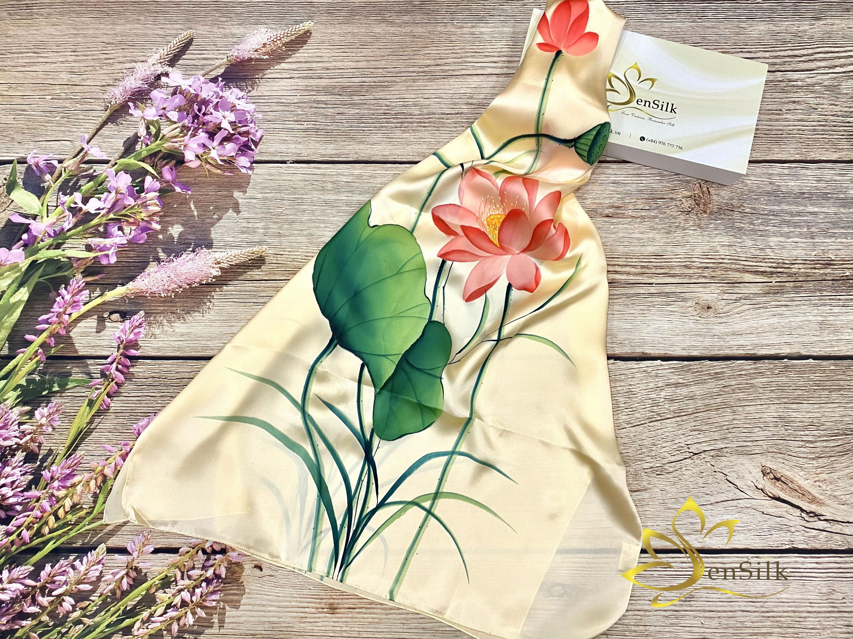 Khăn Lụa Tơ Tằm Vẽ Hoa Sen SenSilk – Quà Tặng 8/3 quốc hoa Việt Nam tượng trưng cho tình yêu và từ bi. Hoa Sen cũng chính là biểu tượng của sự hoàn hảo, thuần khiết, tượng trưng cho bản chất nguyên nguyên thủy của trái tim ý. Hoa sen Việt Nam tượng trưng một cái gì đó vô cùng to lớn, không chỉ mang một ý nghĩa cho đời sống con người mà còn mang một ý nghĩa hoa sen trong một tình yêu trong sáng, tinh khiết. Một tình yêu chân thật và muốn tiến đến hôn nhân hạnh phúc, bạn hãy sử dụng hoa sen biểu tượng tình yêu này sẽ đưa đến nhiều lợi ích cho bạn. ĐẶC ĐIỂM NỔI BẬT CỦA KHĂN LỤA VẼ TAY SENSILK LIMITED – SILK PAINTING *SenSilk nhận vẽ thủ công theo yêu cầu riêng của bạn nha