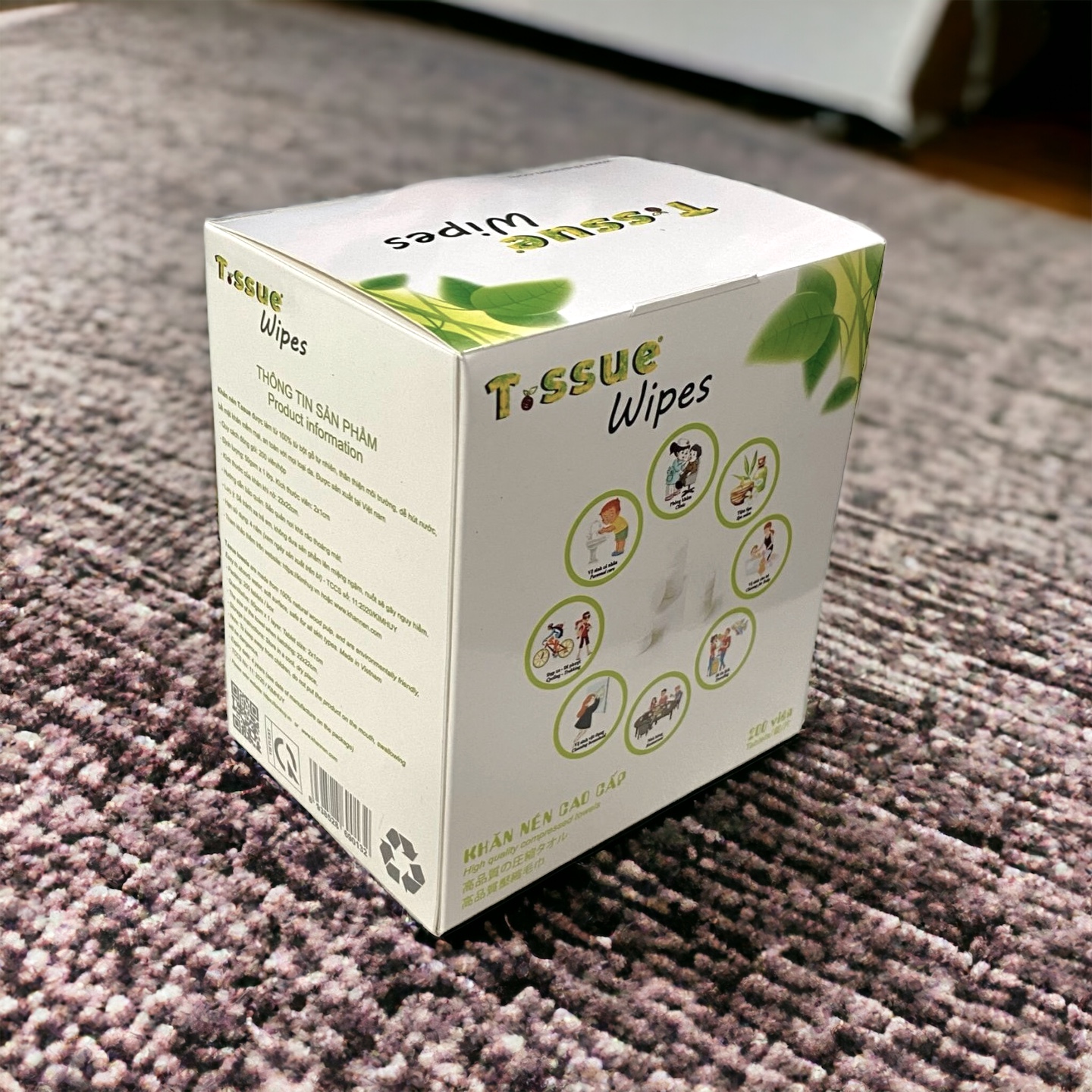 Khăn nén T được làm từ 100% từ bột gỗ tự nhiên, thân thiện môi trường. Khi thấm nước, bề mặt khăn mềm mại, an toàn với mọi loại da. Được sản xuất và đóng gói tại Việt nam trên dây chuyền công nghệ hiện đại. Quy cách đóng gói: 200 viên/hộp. Định lượng: 50gsm x 1 lớp. Kích thước của khăn khi nở: 22x22cm. Sản phẩm sử dụng bao bì bằng giấy theo khuyến nghị, hạn chế sử dụng chất liệu nilong Khăn nén T Wipes được làm từ 100% từ bột gỗ tự nhiên, Không sử dụng mùi hương, dễ chịu, thân thiện môi trường, hút nước nhanh, bề mặt khăn mềm mại, an toàn với mọi loại da. Được sản xuất và đóng gói tại Việt nam trên dây chuyền công nghệ hiện đại.
