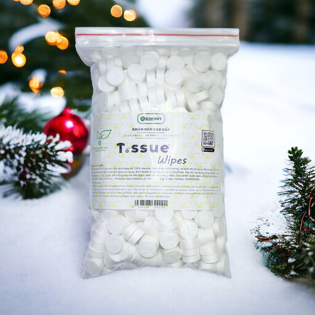 Khăn nén cao cấp T.ssue túi 500 viên dùng trong nhà hàng Khăn nén T.ssue được làm từ nguyên liệu vải không dệt 100% rayon thành phần từ bột gỗ tự nhiên, thân thiện môi trường. Khi thấm nước, bề mặt khăn mềm mại, an toàn với mọi loại da. Được sản xuất và đóng gói tại Việt nam trên dây chuyền công nghệ hiện đại. Quy cách đóng túi: 500 viên/hộp. Định lượng: 50gsm x 1 lớp. Kích thước của khăn khi nở: 22x24cm. Khăn nén T.ssue Wipes được làm từ 100% từ bột gỗ tự nhiên, Không sử dụng mùi hương, dễ chịu, thân thiện môi trường, hút nước nhanh, bề mặt khăn mềm mại, an toàn với mọi loại da. Được sản xuất và đóng gói tại Việt nam trên dây chuyền công nghệ hiện đại.