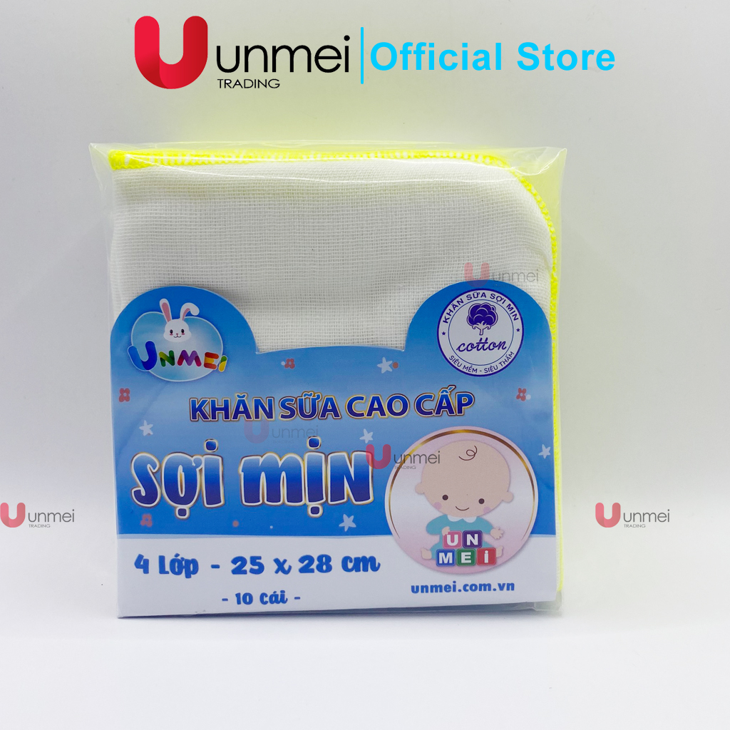 Khăn sữa Unmei 100% cotton cao cấp tiêu chuẩn xuất Nhật, dành cho trẻ sơ sinh. An toàn cho bé, được các mẹ trên toàn quốc tin dùng. - Đường viền của khăn cuốn biên bằng sợi chỉ tơ mềm mại an toàn cho bé.