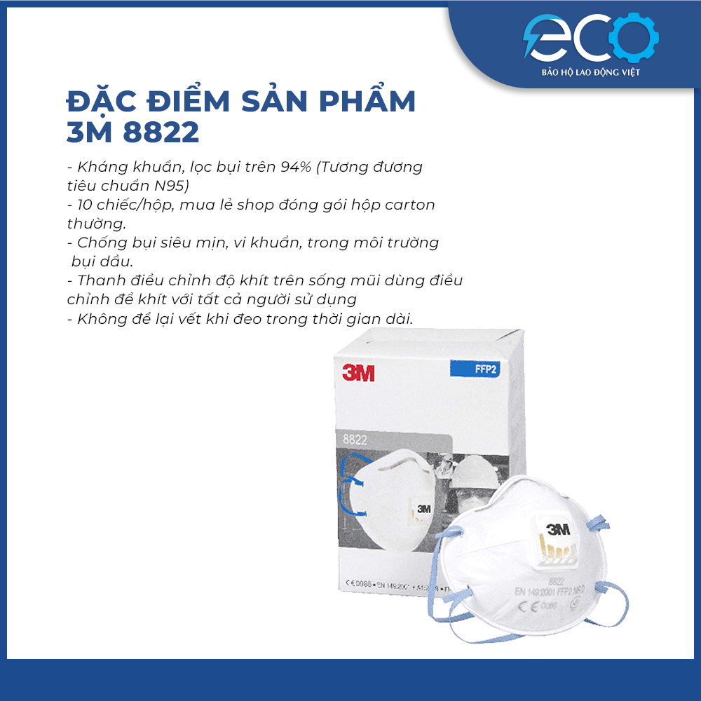 - Quy Cách Đóng Gói: 1 Cái ️ Đặc điểm sản phẩm Khẩu trang 3M 8822: