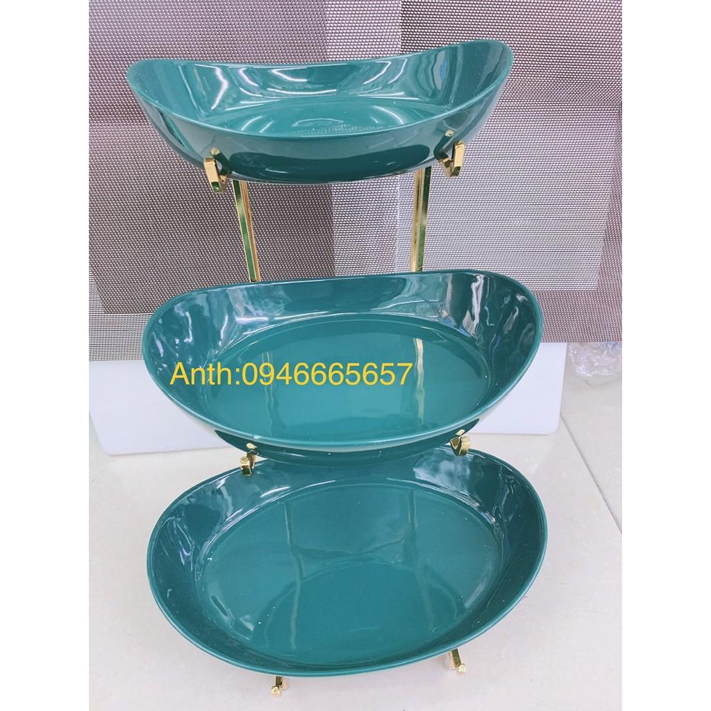 ✨KHAY ĐỰNG BÁNH KẸO HOA QUẢ SỨ MÀU XANH CỔ VỊT HÌNH BẦU DỤC KHUNG KIM LOẠI MẠ VÀNG 3 TẦNG