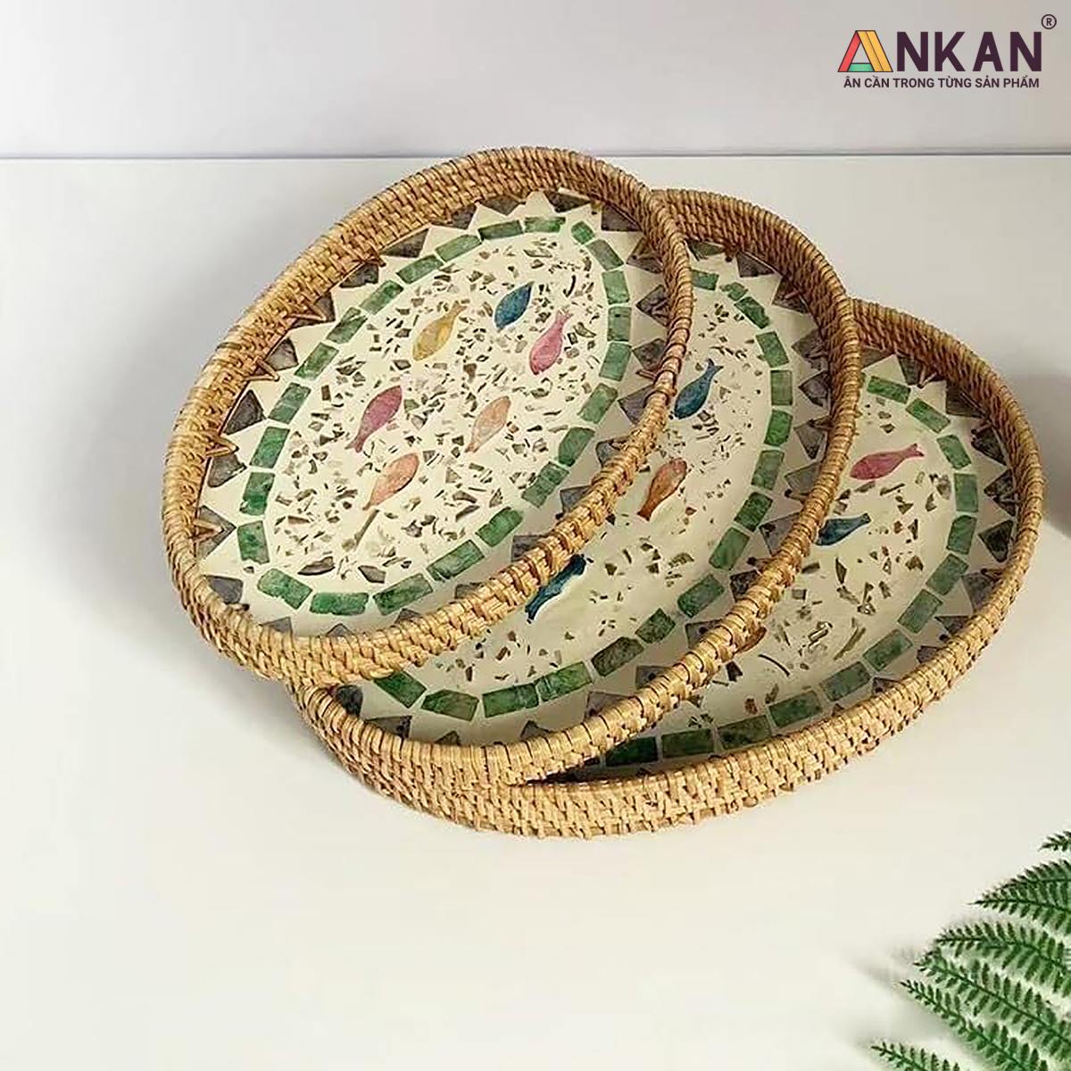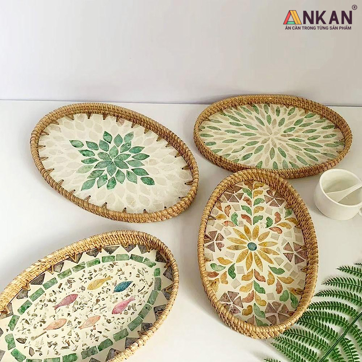 Khay Mây Khảm Trai Thủ Công ANKAN – Decor Trang Trí Nhà Cửa, Đựng Bánh Kẹo, Trái Cây Lưu ý: Hiện tại nhà bán không xuất dược hóa đơn VAT, chỉ có thể xuất hóa đơn bản lẻ. Mong khách hàng thông cảm. Bạn đang tìm một chiếc khay mây khảm trai vừa đẹp – tiện – sang trọng để trang trí bàn ăn, góc decor hay dùng trong bếp?   - Chất liệu mây ép tự nhiên – đã sấy khô chống mối mọt, an toàn khi tiếp xúc trực tiếp với thực phẩm - Đáy khảm trai lấp lánh – ánh ngọc sang trọng, tạo điểm nhấn nổi bật trong không gian - Đa năng, dễ sử dụng – đựng bánh kẹo, trái cây, vật dụng nhỏ hoặc làm phụ kiện chụp ảnh decor -