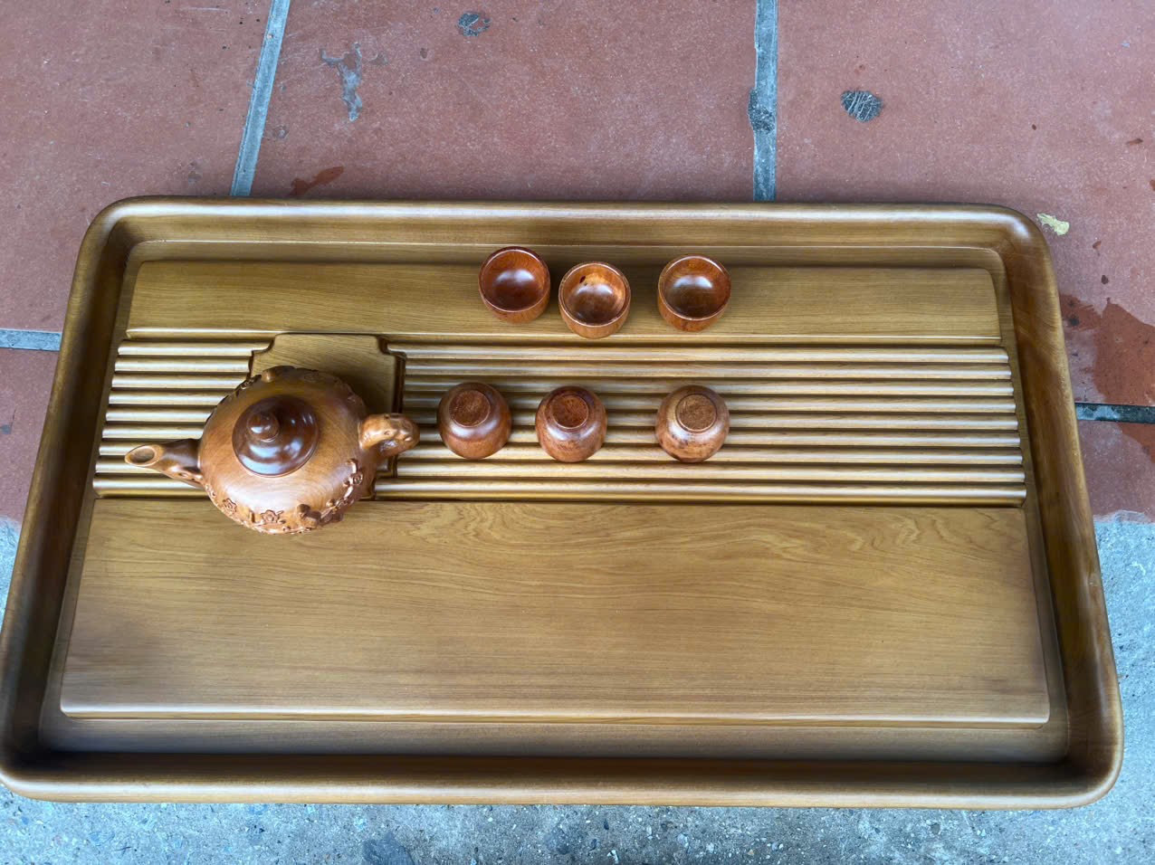 _ Khay trà để bộ ấm chén đặt ở bàn tiếp khách được làm bằng chất liệu gỗ bách xanh liền khối tự nhiên 100%