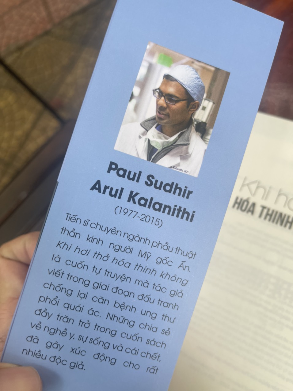 “Khi hơi thở hóa thinh không” là cuốn hồi kí được viết bởi Paul Kalanithi – một bác sĩ phẫu thuật não và cũng là một bệnh nhân ung thư phổi giai đoạn cuối. Paul viết cuốn sách này trong những tháng cuối cùng của cuộc đời anh – khi mà anh đang đối mặt trực tiếp với cái chết.