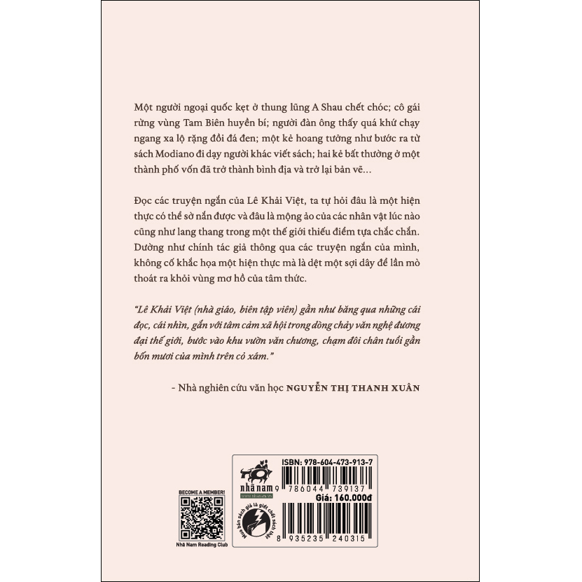 Mua tại TiktokMột người ngoại quốc kẹt ở thung lũng A Shau chết chóc; cô gái vùng Tam Biên huyền bí; người đàn ông thấy quá khứ chạy ngang xa lộ rặng đồi đá đen; một kẻ hoang tưởng như bước ra từ sách Modiano đi dạy người khác viết sách; hai kẻ bất thường ở một thành phố vốn đã trở thành bình địa và trở lại bản vẽ Đọc các truyện ngắn của Lê Khải Việt, ta tự hỏi đâu là một hiện thực có thể sờ nắn được và đâu là mộng ảo của các nhân vật lúc nào cũng như lang thang trong một thế giới thiếu điểm tựa chắc chắn. Dường như chính tác giả thông qua các truyện ngắn của mình, không cố khắc họa một hiện thực mà dệt một sợi dây để lần mò thoát ra khỏi vùng mơ hồ của tâm thức.