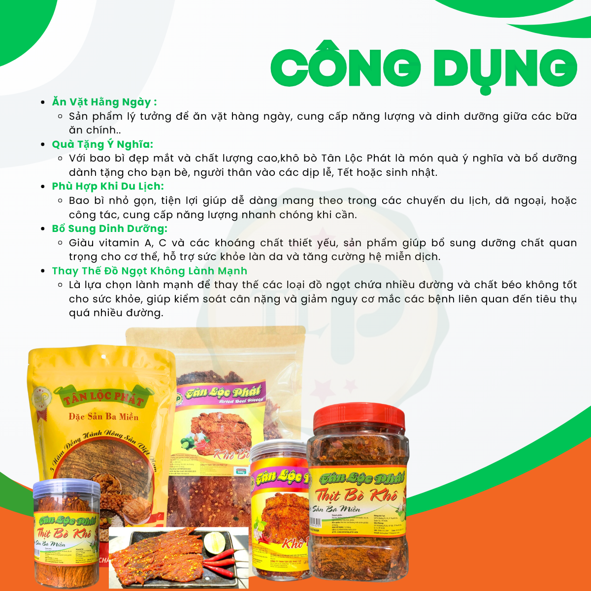 Khô bò được làm từ 100% thịt bò tươi Không chất bảo quản độc hại Được công nhận là Hàng Việt Nam Chất Lương Cao do người tiêu dùng bình chọn Được chứng nhận An