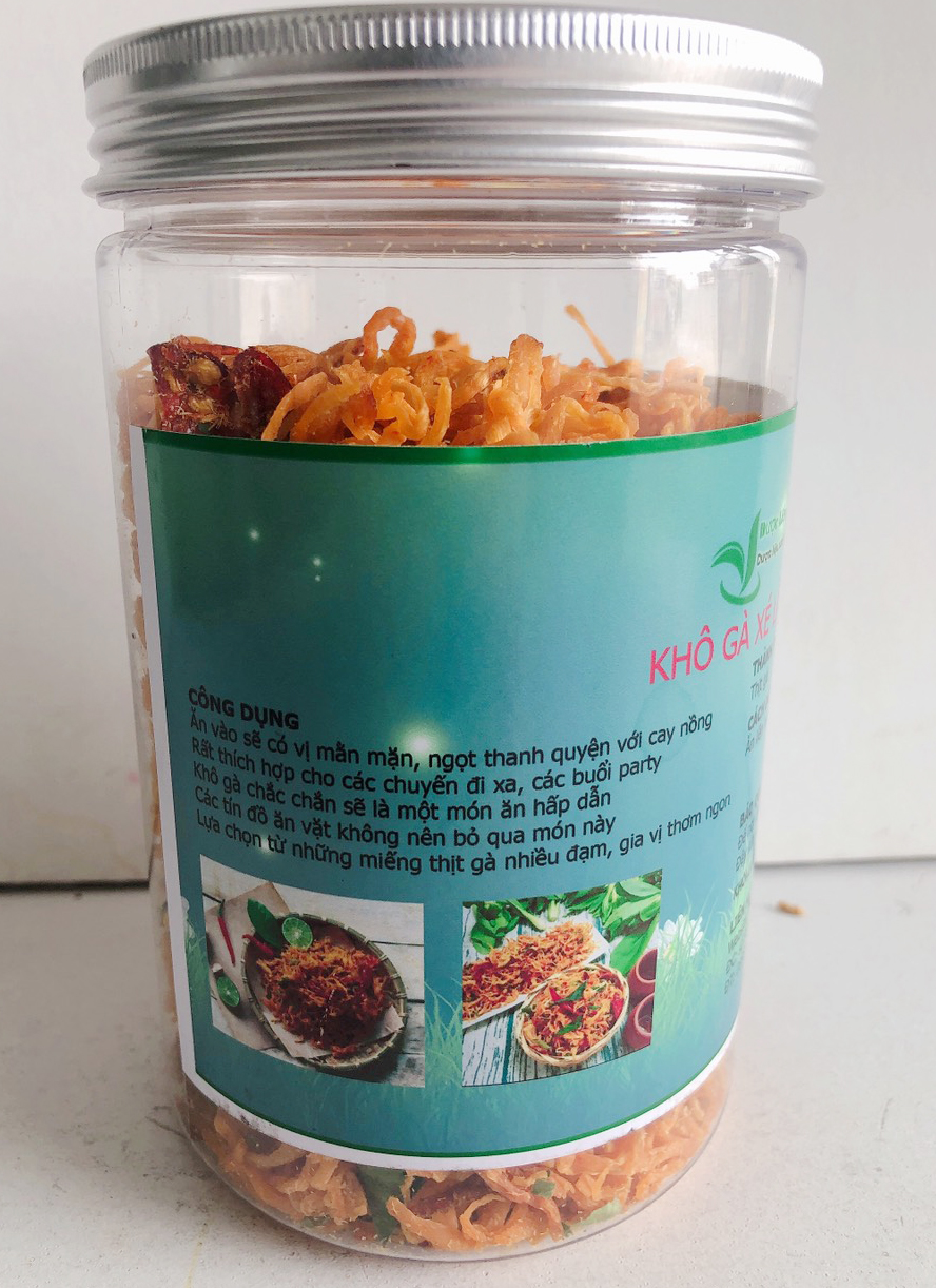 KHÔ GÀ XÉ LÁ CHANH THƯỢNG HẠNG Xuất xứ: Việt Nam. Hạn sử dụng: 12 tháng kể từ ngày sản xuất. Quy cách đóng gói: hủ nhựa pet cao cấp Khô gà lá chanh