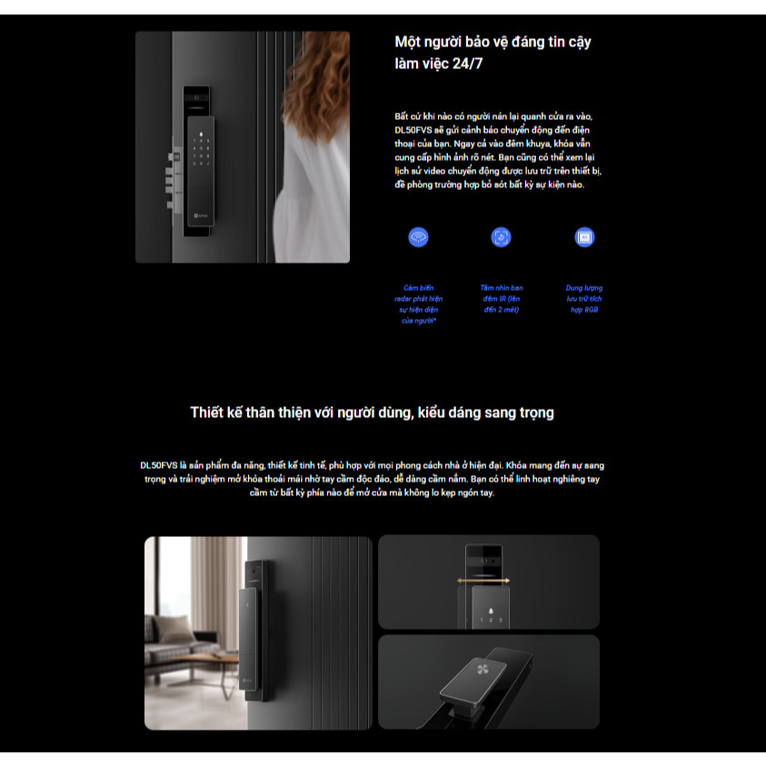 Thông số kỹ thuật khóa cửa vân tay thông minh EZVIZ DL50FVS – Mã sản phẩm: CS-DL50FVS-R100-WBP-GR(6068) – Màu sắc: Xám kim loại – Vật liệu: Hợp kim nhôm – Hỗ trợ mở khóa bằng khuôn mặt – Nhiều chế độ mở khóa: Khuôn mặt, vân tay, mật mã, chìa cơ, chìa bluetooth, qua ứng dụng EZVIZ, mã tạm thời, mở khóa từ xa – Số lượng người dùng 50, khuôn mặt 50, mật khẩu 50 – Tích hợp màn hình màu 4 inch – Hỗ trợ báo động chống cậy phá – Quản lý từ xa qua App – Hỗ trợ cuộc gọi video – Chế độ xem cửa thông minh – Hỗ trợ mã khóa chống nhìn trộm, chế độ riêng tư, quản lý người dùng, thông báo thời gian thực, khóa chống kiểm tra, báo động chống giả mạo, điều khiển từ xa, gọi video, thay đổi giọng nói, phát hiện lang thang. – Hỗ trợ chuẩn chuống nước IP54 – Hỗ trợ nguồn điện sạc khẩn cấp cổng Type-C – Tích hợp pin sạc lithium dung lượng 5000mAh – Độ dày cửa được hỗ trợ: 30-110 mm – Chứng chỉ: CE (EMC/LVD/RED/RoHS)/REACH SVHC/WEEE – Xuất xứ: Trung Quốc – Bảo hành: 24 tháng