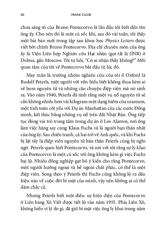 Trong Nhà vật lý hay điệp viên, Frank Close cung cấp cho độc giả những điều từ trước đến nay chưa được kể về cuộc sống của Pontecorvo, dựa trên những tài liệu từ gia đình và bạn bè của Pontecorvo và các nhà khoa học Nga mà sau này ông làm việc. Cuốn sách là một góc nhìn chi tiết về cuộc sống của Pontecorvo trong sự hấp dẫn của một câu chuyện về gián điệp. Một điệp viên, một vụ bắt cóc, cuốn sách này là lịch sử của vật lý hạt nhân với tất cả sự bí ẩn của nó.