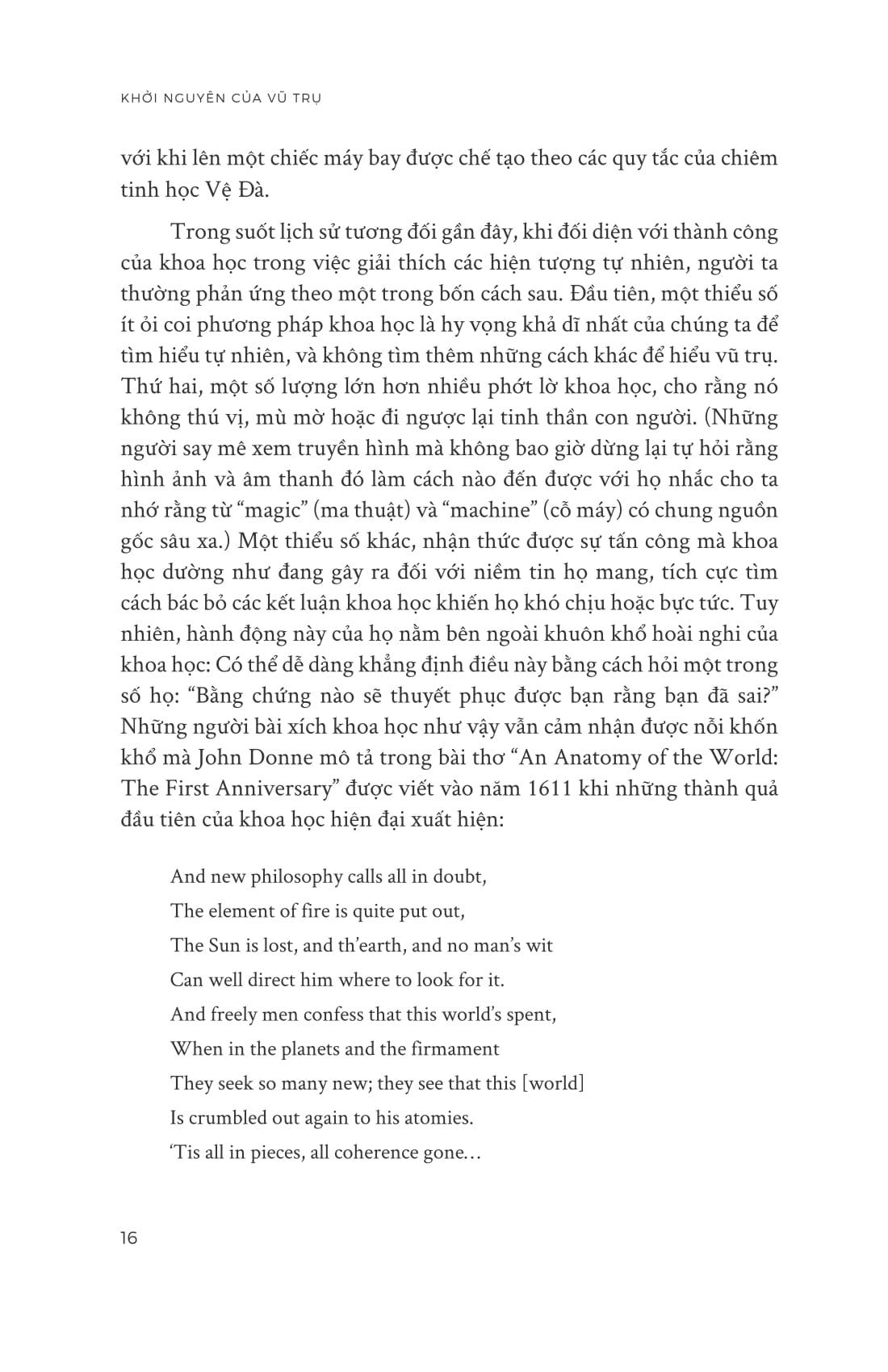 Vì tự coi m.ình là trung tâm – điều đó thấm vào xương tủy ta qua quá trình tiến hóa và những trải nghiệm trên Trái Đất – ta nghiễm nhiên tập trung vào các sự kiện và hiện tượng quanh ta trong hầu hết những câu chuyện về nguồn gốc được kể lại. Tuy nhiên, mỗi tiến bộ trong hiểu biết của chúng ta về vũ trụ lại tiết lộ rằng ta đang sống trên một hạt bụi vũ trụ, quay quanh một ngôi sao điển hình ở vùng ngoại biên xa xôi của một thiên hà thuộc loại phổ biến trong ít nhất hàng trăm tỉ thiên hà của vũ trụ. (tr.11)