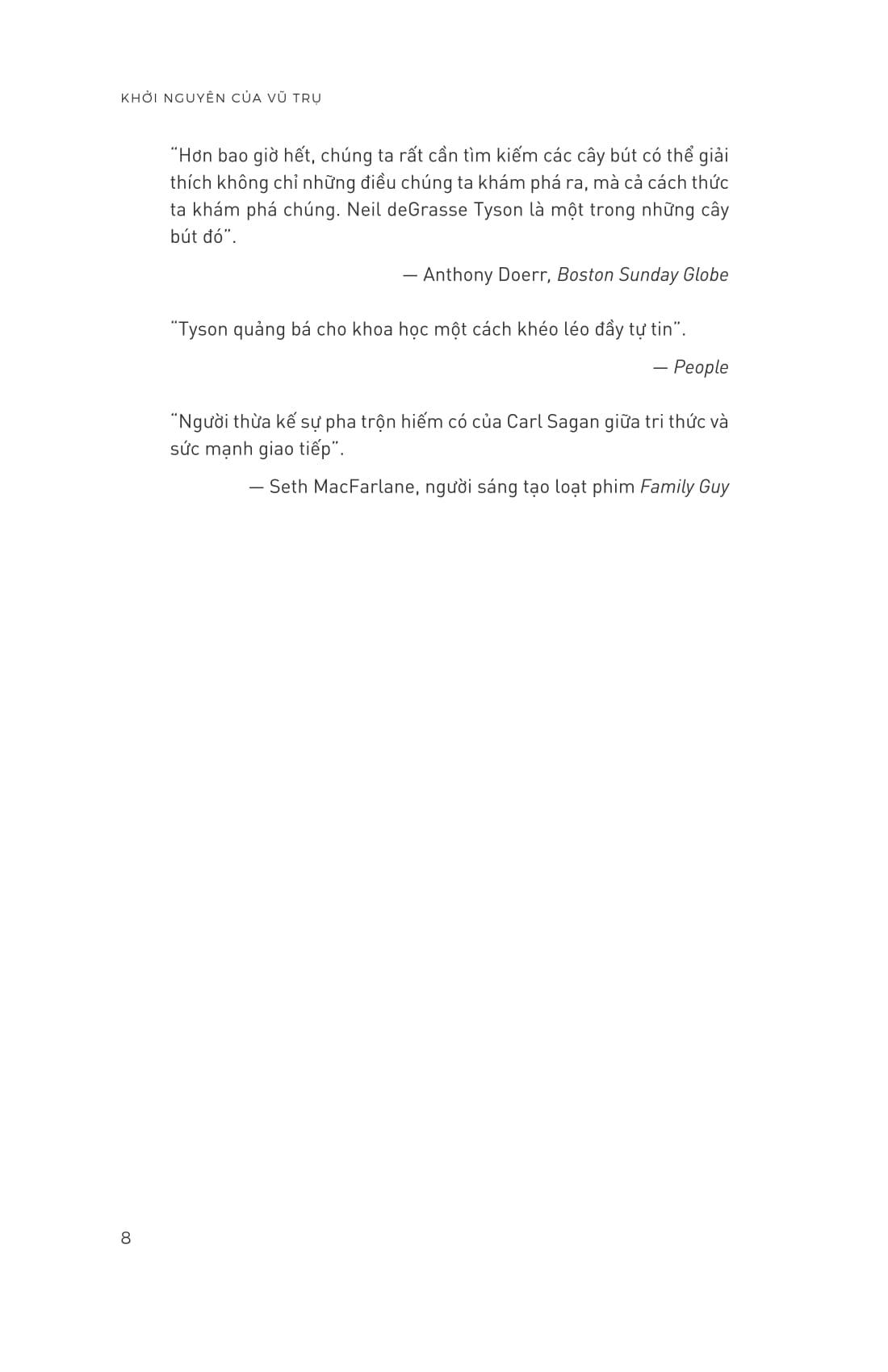 “Khởi nguyên của vũ trụ: Lịch sử 14 tỉ năm tiến hóa” - tác phẩm được viết bởi tác giả bán sách thiên văn bán chạy nhất trên thế giới Neil deGrasse Tyson là một tác phẩm tổng hợp kiến thức khoa học mới đã xuất hiện và đang tiếp tục phát triển. Trong những năm gần đây, đáp án cho các câu hỏi về khởi nguyên vũ trụ của chúng ta không chỉ đến từ lĩnh vực vật lý thiên văn. Khi nghiên cứu trong địa hạt của các lĩnh vực mới nổi với những cái tên như hóa học thiên văn, sinh vật học thiên văn và vật lý hạt thiên văn, các nhà vật lý thiên văn nhận ra rằng họ có thể hưởng lợi rất nhiều từ sự pha trộn mang tính cộng tác với các ngành khoa học khác. Việc vận dụng nhiều nhánh khác nhau của khoa học để tìm lời giải đáp cho câu hỏi “Ta đến từ đâu?” mang lại cho các nhà nghiên cứu một nguồn sức mạnh mới, xuất phát từ sự hiểu biết có bề rộng và chiều sâu chưa thể mường tượng trước đó về cách thức vận hành của vũ trụ.