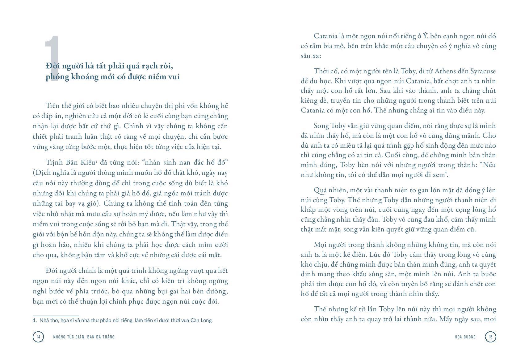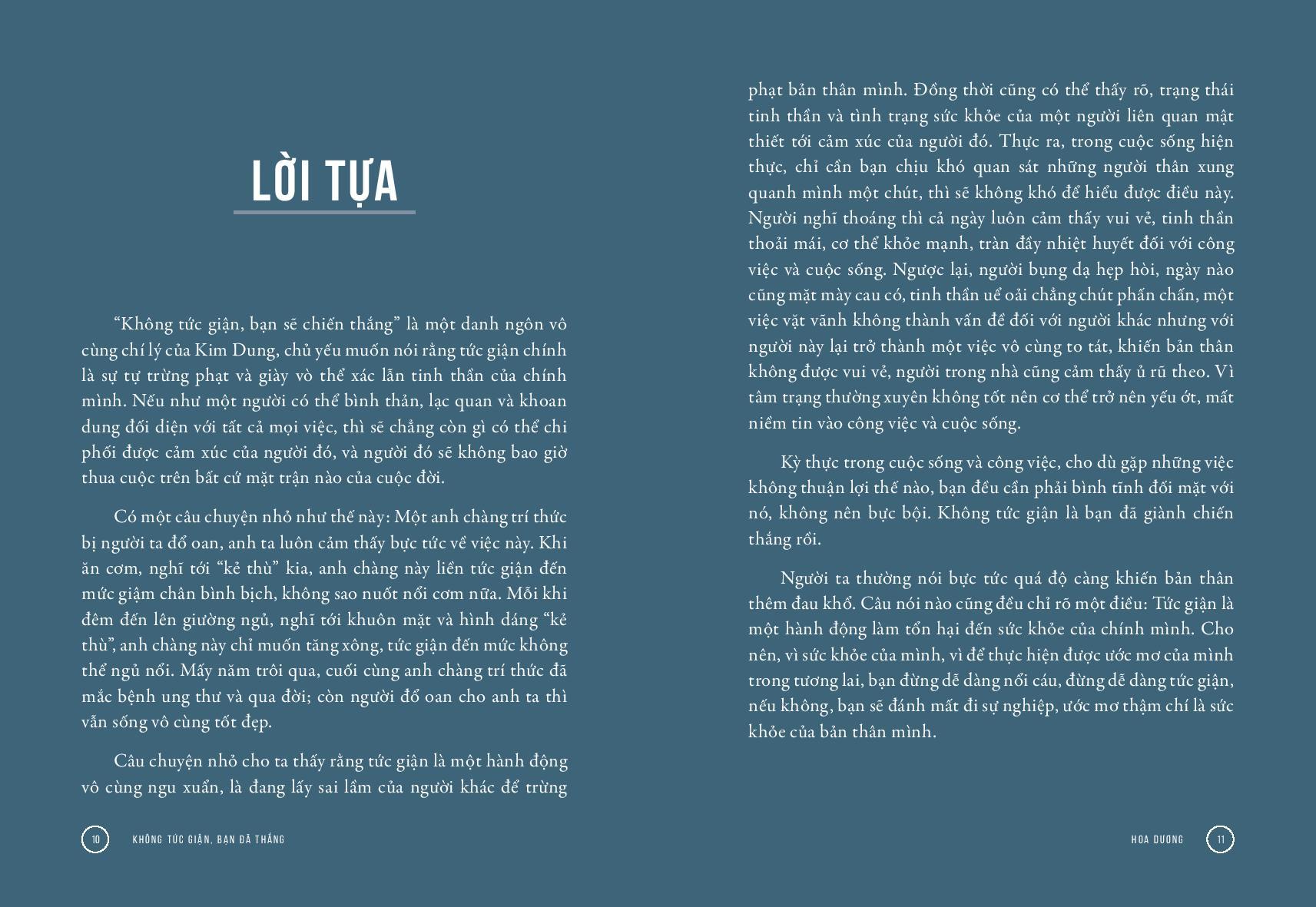 Không tức giận, bạn đã thắng sẽ cùng bạn đi sâu vào từng ngóc ngách cảm xúc, thấu rõ mọi nấc thang của cơn giận. Từ đó, tìm ra điểm cân bằng cho tâm trạng, xoay chuyển thái độ và mài giũa khả năng kiềm chế cảm xúc, trở thành viên kim cương quý giá dưới những áp lực cuộc đời.