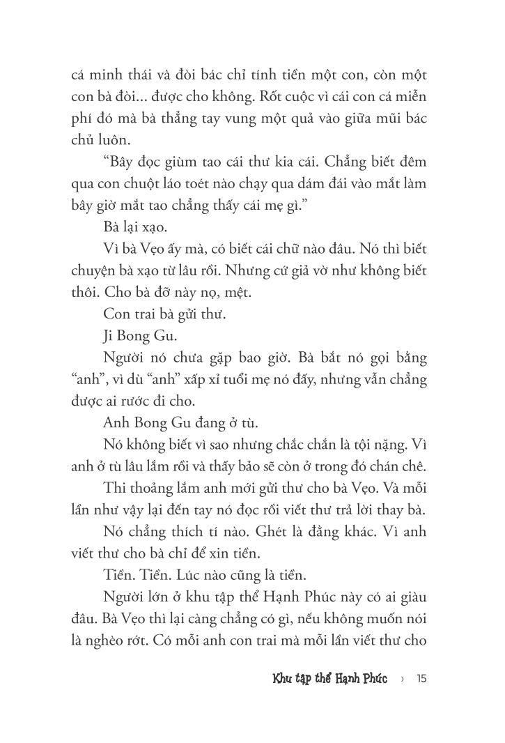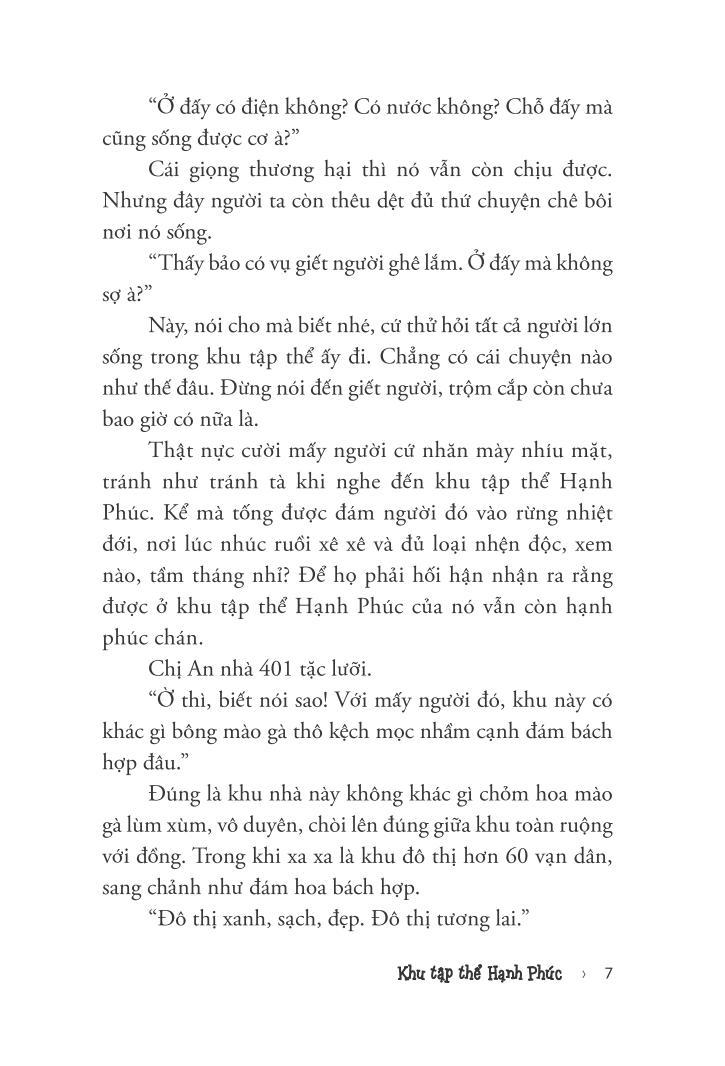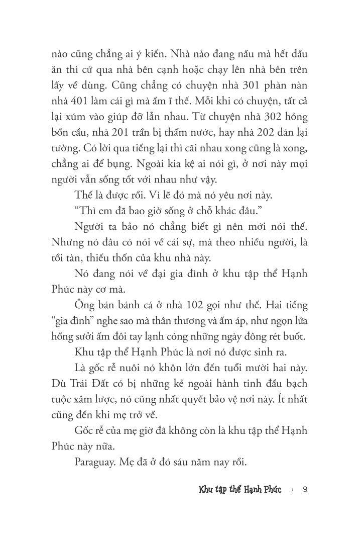 Ở một khu tập thể có tên Hạnh Phúc nằm chơ vơ vùng ven đô tiêu điều, vắng bàn tay săn sóc của mẹ nhưng Dong Dong lớn lên chưa bao giờ thiếu tình thương hay phải tự thương mình là đứa trẻ bất hạnh. Tất cả là nhờ vòng tay chở che vô điều kiện của những người hàng xóm không phải máu mủ ruột rà của cậu.