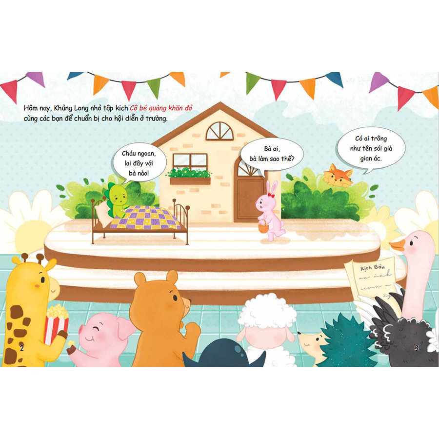 Cầm bộ sách được minh họa đẹp mắt trên tay, hẳn các em nhỏ sẽ tự hỏi hằng ngày bạn Khủng Long làm gì, chơi gì, bạn ấy có những đức tính gì, cần khắc phục khuyết điểm ra sao. Trong bộ sách Khủng Long nhỏ - Tính hay ho, chúng ta sẽ gặp một cậu chàng Khủng Long với “kha khá” đức tính tốt: chăm chỉ, nhiệt tình, hòa đồng, yêu thích thể thao… nhưng cũng còn những điểm cần điều chỉnh, chẳng hạn bạn ấy còn lơ đễnh, thiếu tập trung nên có lúc quên mất việc quan trọng: “Khủng Long nhỏ reo lên vui sướng. Cậu thích thú quan sát con ếch màu xanh đang nhảy nhót trên nền gạch và quên mất ba đang đứng đợi mình ở bến xe buýt” (trích Khủng Long nhỏ hay quên); hoặc chưa thuộc được lời thoại lúc tập kịch: “Mồm bà to vì… vì… Ôi, tớ lại quên lời thoại rồi! Xin lỗi các bạn!” (trích Khủng Long nhỏ lạc quan), hoặc có lúc bạn ấy cũng không tự tin vào chính khả năng của mình “Có phải là con chơi bóng thật tệ không ba?” (Khủng Long nhỏ thích thể thao)… Ôi chao, hóa ra Khủng Long nhỏ cũng gặp khó khăn và thiếu tự tin như tất cả chúng mình đấy thôi!