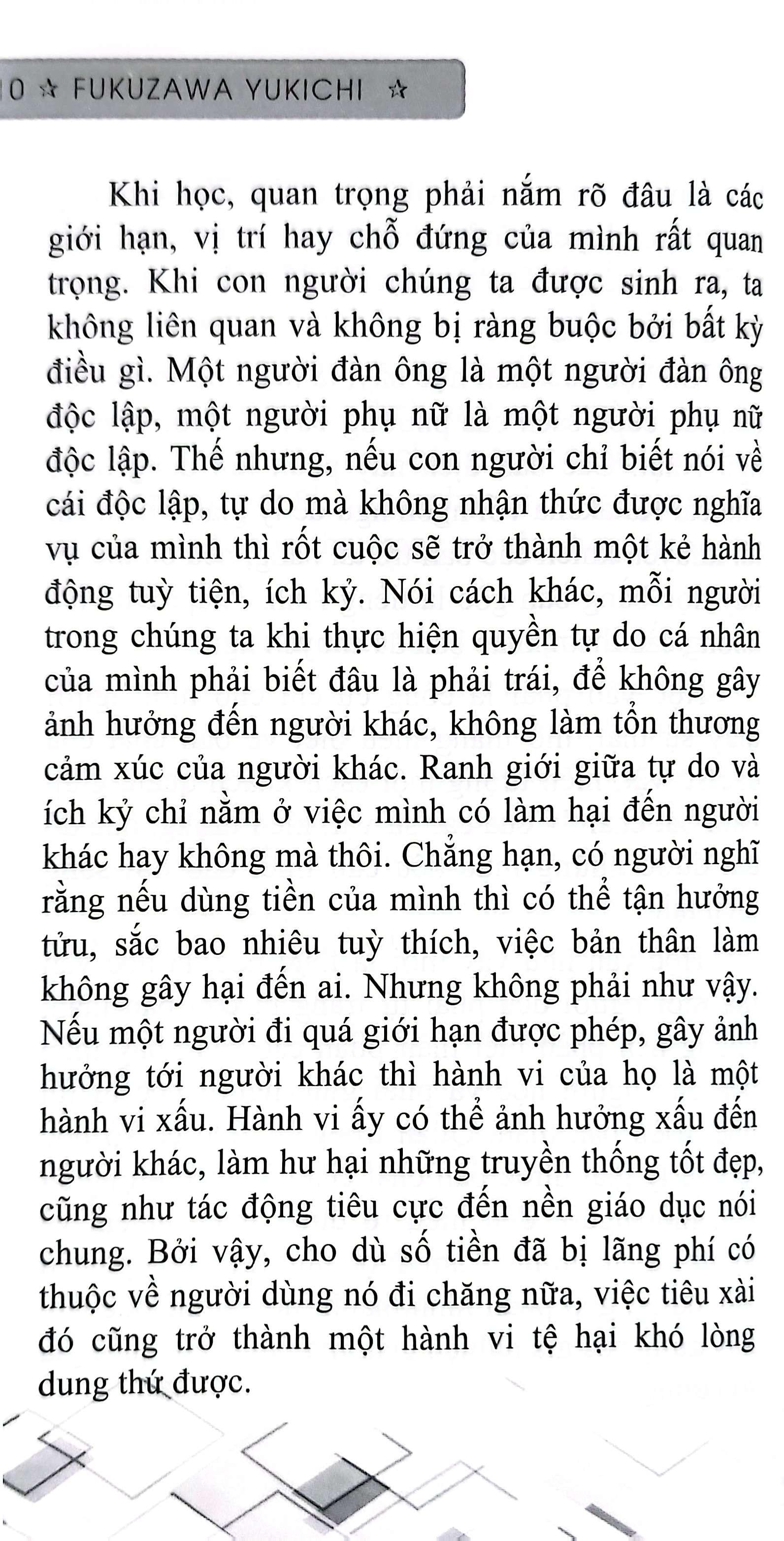 Đó là điều mà bạn sẽ tìm thấy khi chiêm ngẫm những trang của cuốn sách “Khuyến học” – một cuốn sách có ảnh hưởng vĩ đại đến người dân Nhật Bản nói riêng và những dân trên toàn thế giới nói chung – tạo ra một luồng gió mới khi nghĩ về vấn đề “học vấn”.