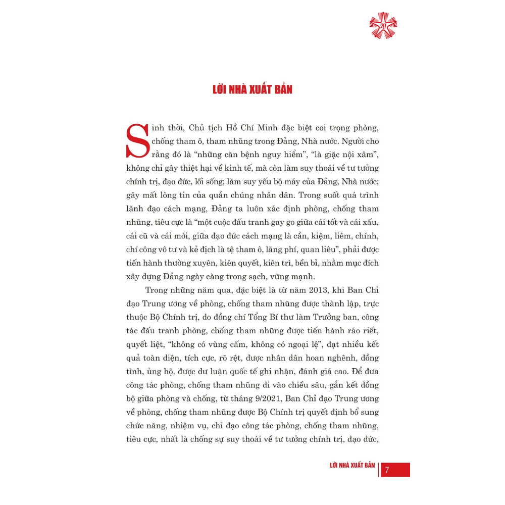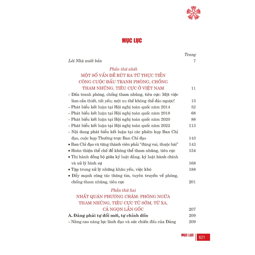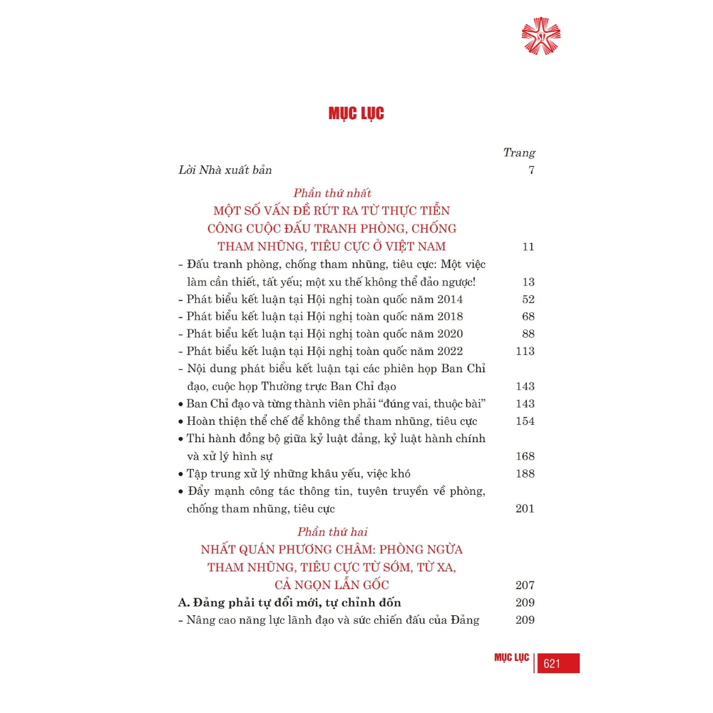 Phần thứ nhất có tiêu đề: “Một số vấn đề rút ra từ thực tiễn công cuộc đấu tranh phòng, chống tham nhũng, tiêu cực ở Việt Nam”, gồm bài viết tổng quan; 4 bài phát biểu kết luận tại các Hội nghị toàn quốc về công tác phòng, chống tham nhũng, tiêu cực các năm 2014, 2018, 2020, 2022 và trích kết luận chỉ đạo của đồng chí Tổng Bí thư Nguyễn Phú Trọng, Trưởng Ban Chỉ đạo Trung ương về phòng, chống tham nhũng, tiêu cực tại 36 phiên họp, cuộc họp của Ban Chỉ đạo, Thường trực Ban Chỉ đạo từ năm 2013 đến năm 2022.