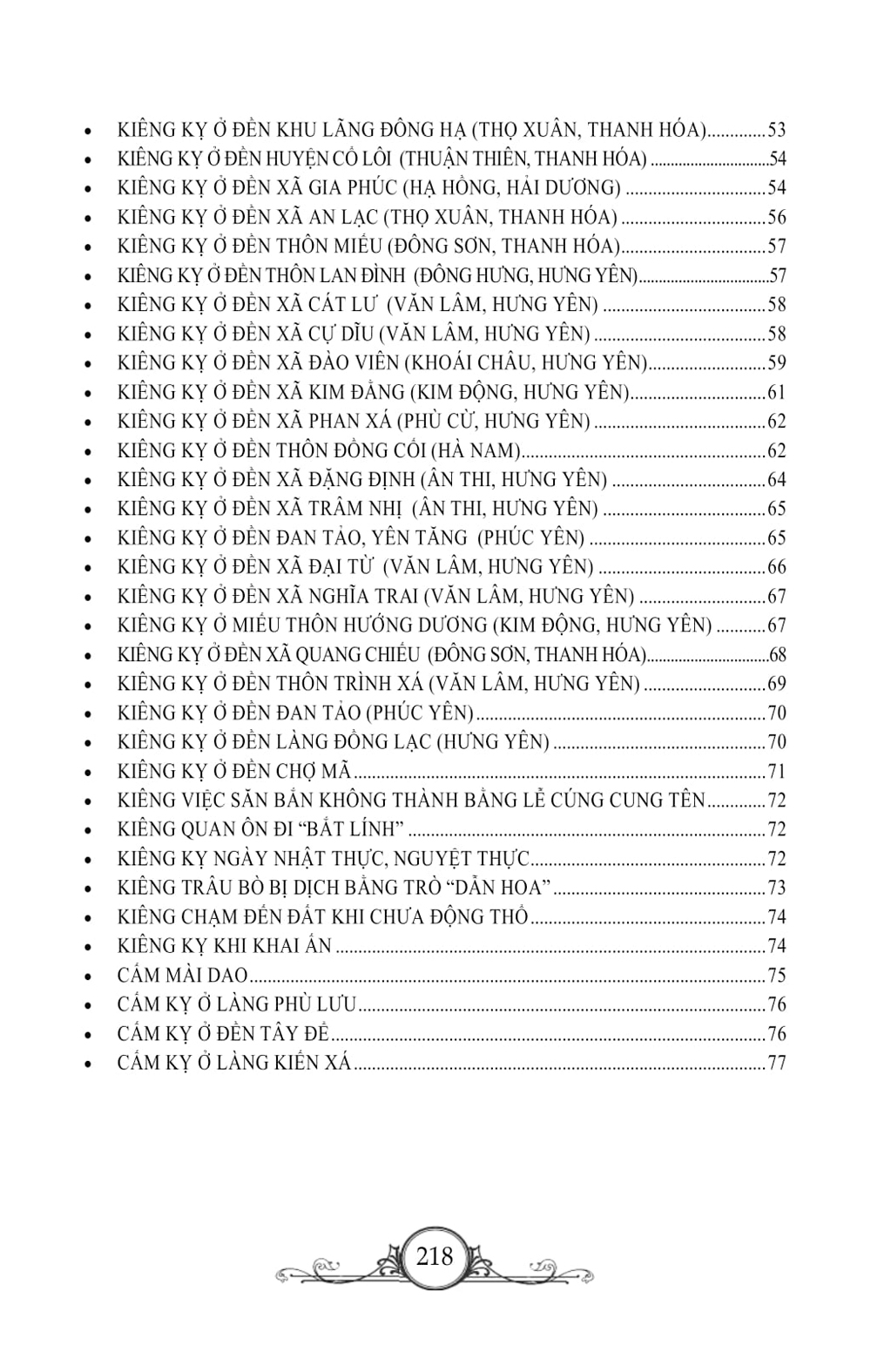 Quan niệm Kiêng và Cấm kỵ của người Việt chắc hẳn hình thành từ thời xa xưa, khi người Việt trải qua bao cuộc vật lộn sinh tồn, đã đúc rút được nhiều kinh nghiệm và cả những may rủi mà họ không sao giải thích được. Ẩn hiện qua tín ngưỡng, tâm lý, hiện hình thành những quy định trong phong tục, tập quán và tồn tại với một sức sống dai dẳng đến kỳ lạ, Kiêng và Cấm kỵ thể hiện một biểu trưng của văn hóa tộc người, là một tất yếu mang đậm dấu ấn của một dân tộc sống bằng nghề nông, phải trải qua nhiều cuộc chinh chiến chống ngoại xâm và chịu ảnh hưởng không nhỏ của nước láng giềng Trung Quốc. Quan niệm Kiêng và Cấm kỵ của người Việt hiện hữu, nhiều khi là vô thức và có thể bắt gặp ở nhiều nơi, phổ biến trong các lễ nghi ở đền, đình, miếu, phủ, trong những ngày Tết thường niên, những ngày lễ hội và nghi lễ vòng đời người. Quan niệm này trải qua bao thời gian vẫn được cộng đồng tuân thủ một cách tự giác với niềm kính tín và hy vọng vào sự may mắn, tránh mọi sự rủi ro. Cuộc sống sôi động hiện nay với khoa học và kỹ thuật phát triển, có chăng chỉ đào thải một số kiêng kỵ trong cách hành xử ở tầng lớp trẻ nhưng đa phần, sự kiêng và cấm kỵ này cơ bản vẫn tồn tại, được chấp nhận với quan niệm "Có kiêng có lành". Chính quan niệm này khiến nhiều người có trình độ văn hóa cao, hiểu biết song vẫn vui lòng và tự nguyện tuân thủ mọi quy định về kiêng kỵ đã được truyền thống bảo lưu. Đứng ở góc độ này, nhiều điều kiêng và cấm kỵ là có thể hiểu và chấp nhận được. Thực tế các địa danh trong sách đã có những thay đổi so với hiện nay, tuy nhiều điều kiêng và cấm kỵ đã trở nên không thích hợp nhưng sự tồn tại hữu hình và nhiều khi là vô thức của nó vẫn đáng để suy ngẫm về một trong những đặc điểm văn hóa của tộc người Việt trên con đường phát triển.