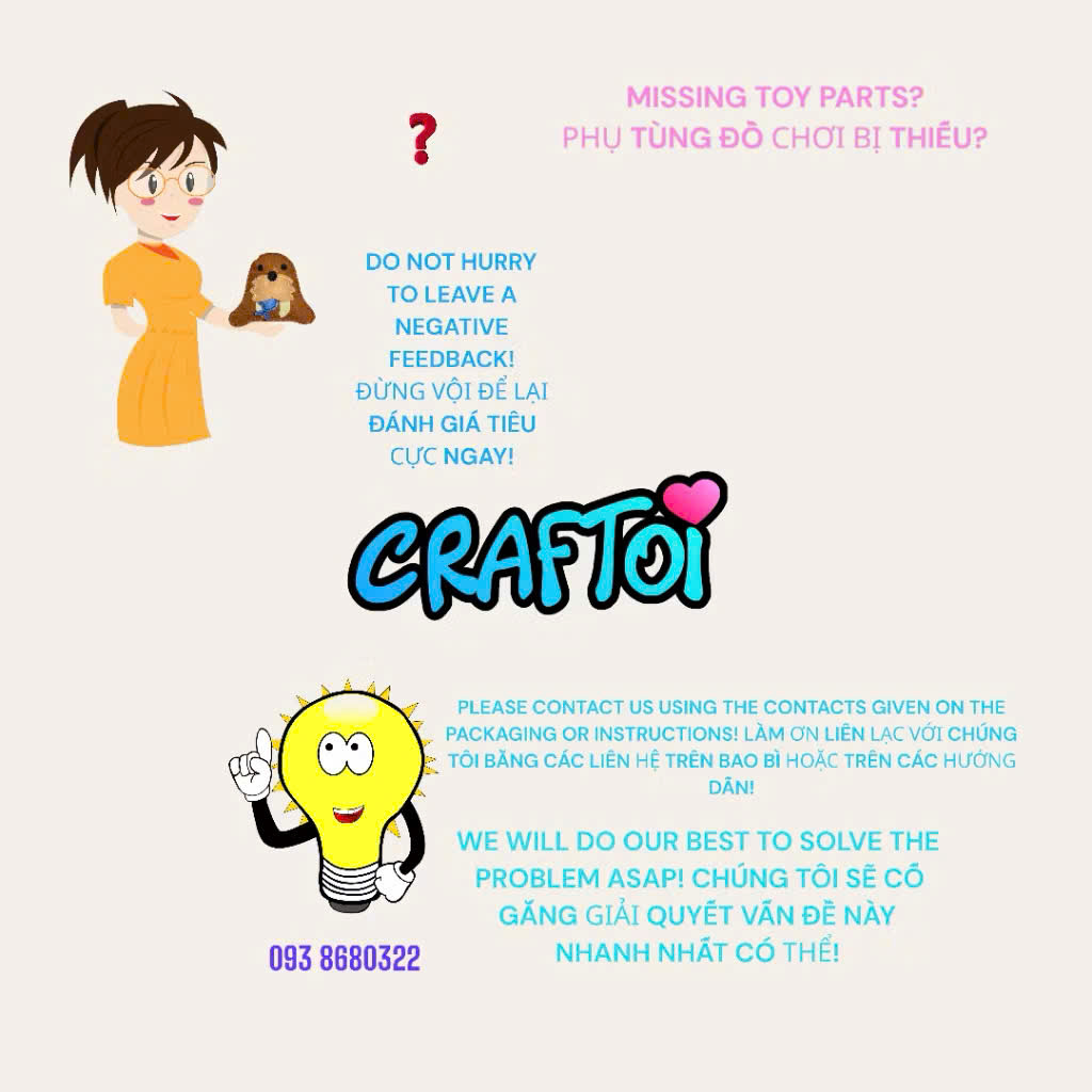 Mua tại Tiktok*** Thông tin sản phẩm Mã hàng: CAT BAG Tuổi sử dụng: 5+ Kích thước: 21x18 cm Một bộ bao gồm: 9 bộ phận làm bằng vải nỉ Chỉ may và bông nhồi Kim an toàn làm bằng nhựa Bảo quản: trong phòng khô thoáng. Thành phần: polyester, nhựa. Năm sản xuất: 2023 Độ bền của sản phẩm: sử dụng không giới hạn!!! Xuất xứ VIỆT NAM !!!!!!! Được Trung Tâm Giám Định Và Chứng Nhận Hợp Chuẩn Hợp Quy VietCert đánh giá chứng nhận phù hợp Quy chuẩn QCVN 3:2019/BKHCN của Bộ Khoa Học - Công nghệ. Đồ chơi sáng tạo từ nhồi bông. Hãy bắt đầu may con búp bê đầu tiên của bạn!!! Cực kì dễ dàng may với lỗ đục săn và kim làm bằng nhựa rất an toàn. Bé tự may thú bông cho mình Các bạn nhỏ tự tay may vá Vì mất nhiều thời gian tự may, bé sẽ yêu quý con thú bông của mình hơn. Rèn luyện tính kiên nhẫn kỹ năng tư duy logic cho trẻ em Sử dụng vải sang trọng an toàn Mềm mại hơn, thích hợp cho bé chơi Được làm từ bông PP mềm Tự làm thú nhồi bông sẽ giúp trẻ nâng cao kỹ năng tập trung, khéo léo của đôi bàn tay. Đồng thời giúp trẻ trân trọng và nâng niu hơn những gì do chính tay mình làm ra. Bộ sản phẩm handmade Sewing giúp trẻ em tự làm thú nhồi bông một cách dễ dàng. Rất đơn giản, trẻ có thể dễ dàng dùng KIM NHỰA khâu các miếng nỉ được đã đục lỗ sẵn cùng với chỉ thêu đính kèm, và sau đó nhồi thêm bông để tạo ra một con vật vô cùng đáng yêu. Mẹ hãy giúp em thực hiện món đồ này để có những kỉ niệm thật vui với nhau nha! Tất cả đã gói gọn trong bộ sản phẩm tự làm thú nhồi bông của Craftoi, vô cùng an toàn và lại rất dễ. CAT BAG Creativity set. Stuffed toy. Sewing my first doll !!! Easy to sew with a prepunched holes and safety plastic needle. 5+ DIMENSIONS: 21x18 cm THE SET INCLUDES: 9 FELT PARTS THREADS SAFETY PLASTIC NEEDLE Storage: in dry ventilated rooms. Materials: polyester, plastic. Service life is not limited !!! MADE IN VIETNAM Has been assessed to conform to the Standard OCIN 3:2019 BKHCN of the Ministry of Science and Technology by VIETCERT CERTIFICATION AND INSPECTION CENTRE
