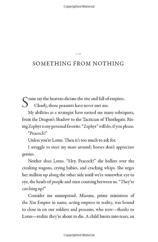 Orphaned at a young age, Zephyr took control of her fate by becoming the best strategist of the land and serving under Xin Ren, a warlordess whose loyalty to the empress is double-edged―while Ren’s honor draws Zephyr to her cause, it also jeopardizes their survival in a war where one must betray or be betrayed. When Zephyr is forced to infiltrate an enemy camp to keep Ren’s followers from being slaughtered, she encounters the enigmatic Crow, an opposing strategist who is finally her match. But there are more enemies than one―and not all of them are human.