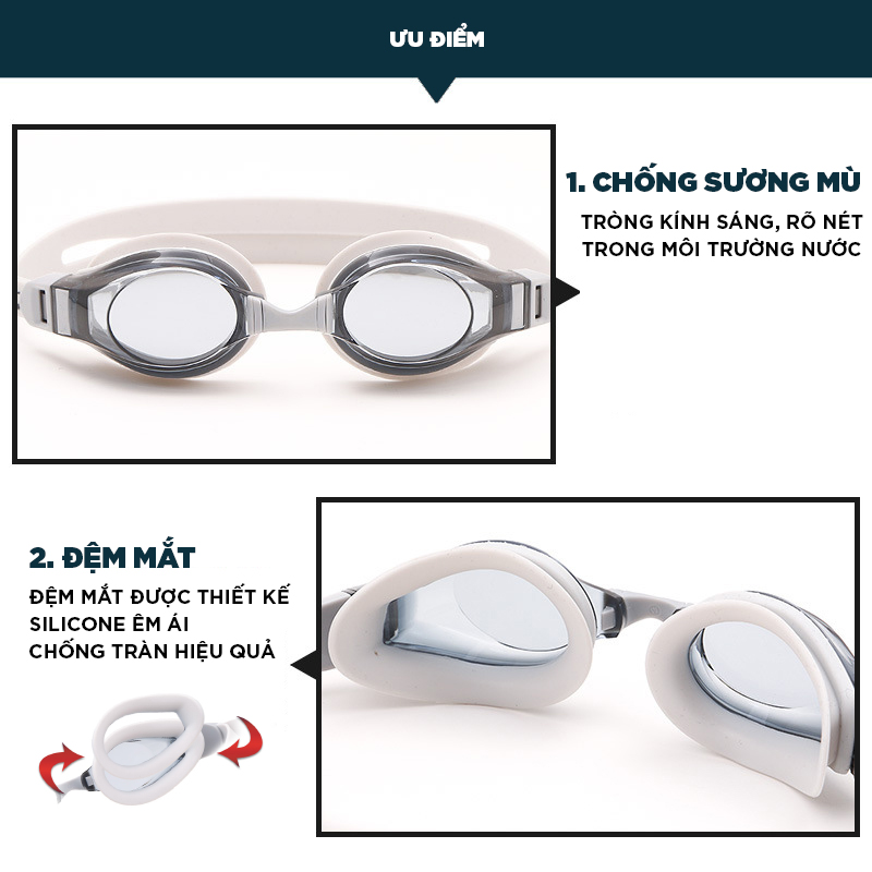 - Vòng cao su chụp mắt được làm 100% silicone không gây kích ứng da. Được thiết kế theo nhân trắc học, giúp kính ôm sát mắt, chống vào nước và giúp mở rộng tối đa góc nhìn khi đeo.