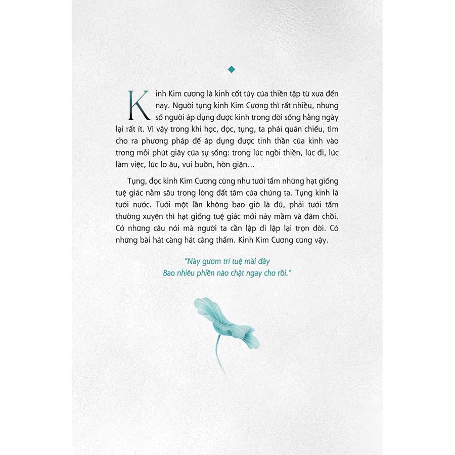 Kinh Kim cương là kinh cốt tủy của thiền tập từ xưa đến nay. Người tụng kinh Kim Cương thì rất nhiều, nhưng số người áp dụng được kinh trong đời sống hằng ngày lại rất ít. Vì vậy trong khi học, đọc, tụng, ta phải quán chiếu, tìm cho ra phương pháp để áp dụng được tinh thần của kinh vào trong mỗi phút giây của sự sống: trong lúc ngồi thiền, lúc đi, lúc làm việc, lúc lo âu, vui buồn, hờn giận...