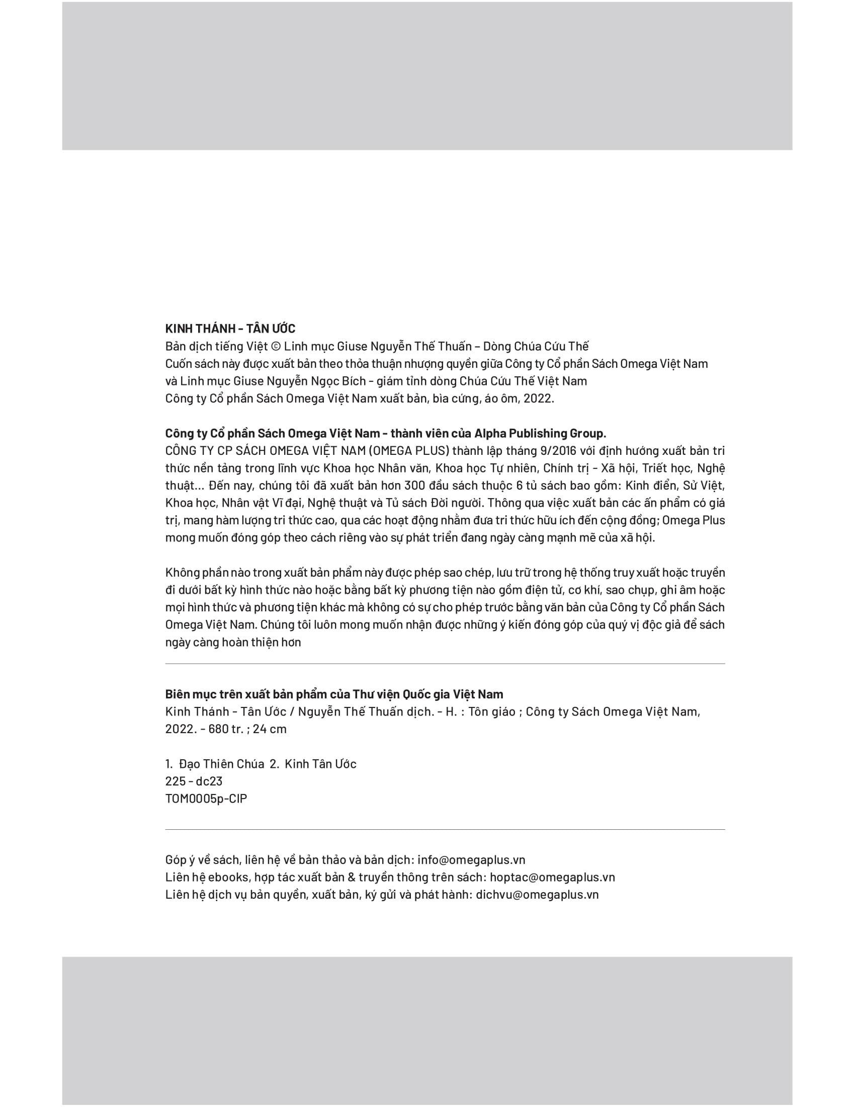 Bản tiếng Việt do Omega+ xuất bản là bản dịch của cố Linh mục Giuse Nguyễn Thế Thuấn - một học giả uyên thâm của Giáo hội Công giáo Việt Nam, lâu nay được xem là một trong những công trình dịch thuật khả tín, khoa học nhất đã từng được xuất bản bằng tiếng Việt, được giới nghiên cứu đánh giá rất cao và là nguồn tài liệu tham khảo quan trọng đối với các chủng sinh Đại Chủng viện, Học viện của các Dòng Tu…