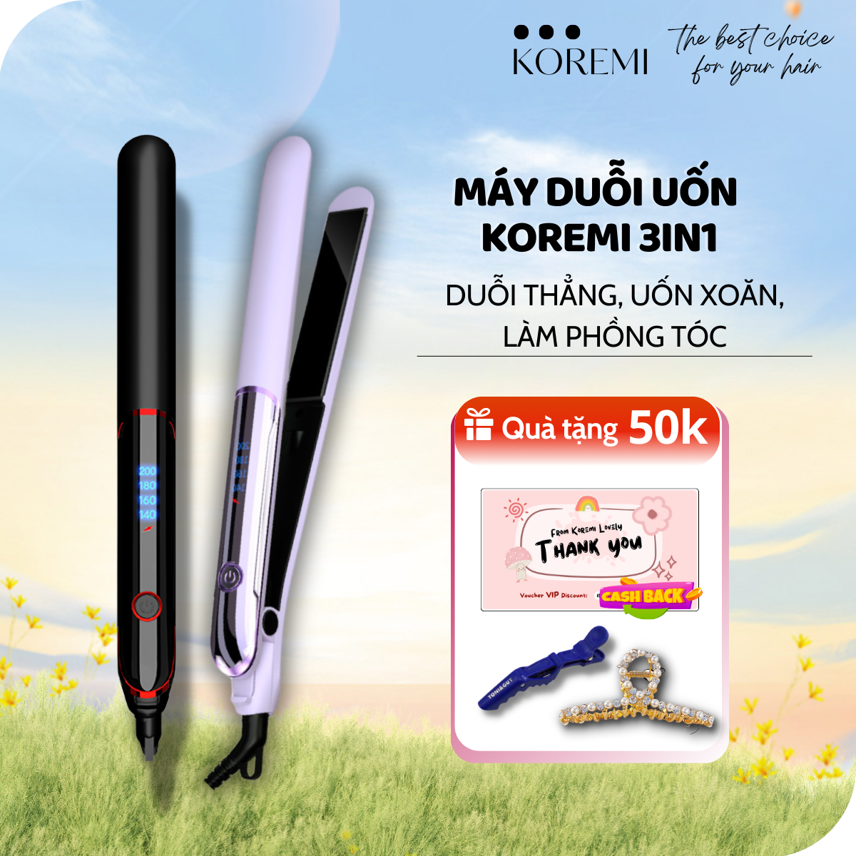✨KOREMI Máy uốn duỗi 3in1 Duỗi Thẳng, Uốn Xoăn, Làm Phồng Tóc X3 ion âm, Giúp tóc suôn mượt Hàng Chính Hãng