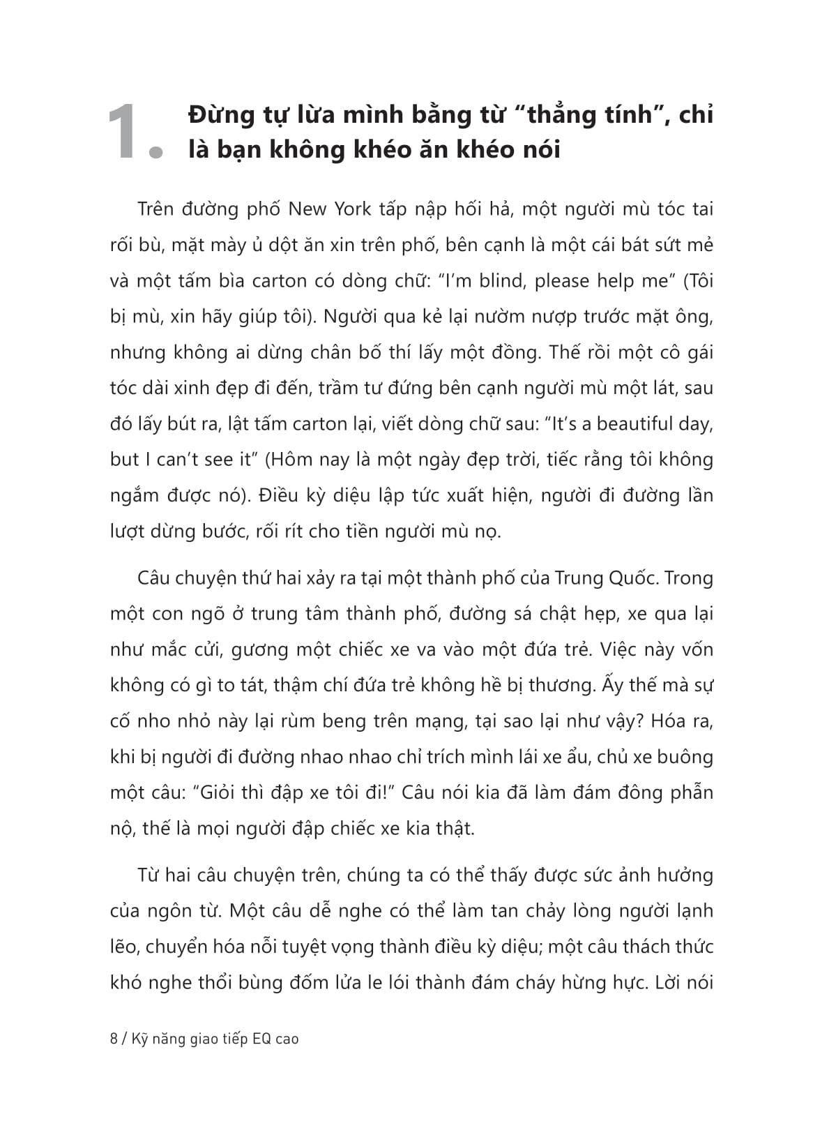 “Thẳng tính” chỉ là một từ để bao biện cho sự vụng về trong cách giao tiếp của người EQ thấp. Vậy thế nào là nói chuyện EQ cao? Hãy ghi nhớ công thức: “ngôn ngữ + tâm lý”, nắm bắt suy nghĩ của người khác, tìm ra điểm tích cực trong lời nói tiêu cực, loại bỏ khuôn khổ giới hạn trong tư tưởng... Nếu bạn có suy nghĩ “Nói chuyện khéo léo là do trời sinh”, bạn đã nhầm. Giao tiếp tốt không phải do tính cách mà là một loại kỹ năng, chỉ cần bạn bồi dưỡng, luyện tập thường xuyên là được.