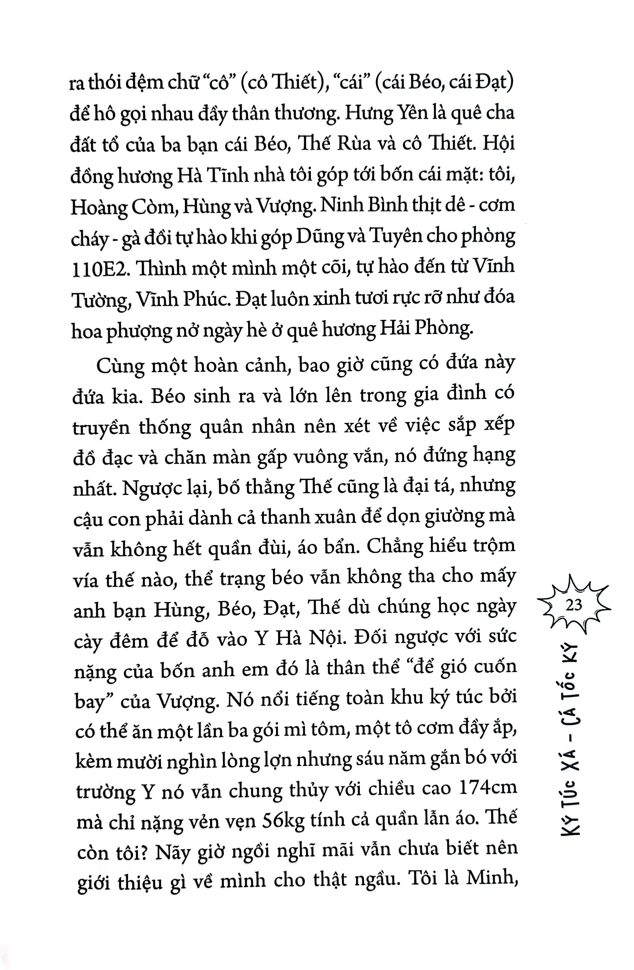 Quá trình làm sách cho tôi may mắn được biết tới Trường - người em khoá sau và là hoạ sĩ tuyệt vời của những tấm hình minh hoạ trong Ký túc xá – Cá tốc ký. Tôi quý sự lễ phép của em và trân trọng cách làm việc tận tâm, chuyên nghiệp trong từng bức vẽ em thể hiện. Cảm ơn em thật nhiều. Gửi đến anh Vũ lời cảm ơn chân thành, anh luôn động viên tôi viết và chia sẻ với mọi người những gì m.ình trải nghiệm. Dẫu biết rằng đôi lúc khoảng cách giữa tự tin và tự cao là mong manh, nhưng tôi nghĩ khi bản thân hiểu giá trị m.ình đang nằm nơi đâu, đó cũng là một hạnh phúc.