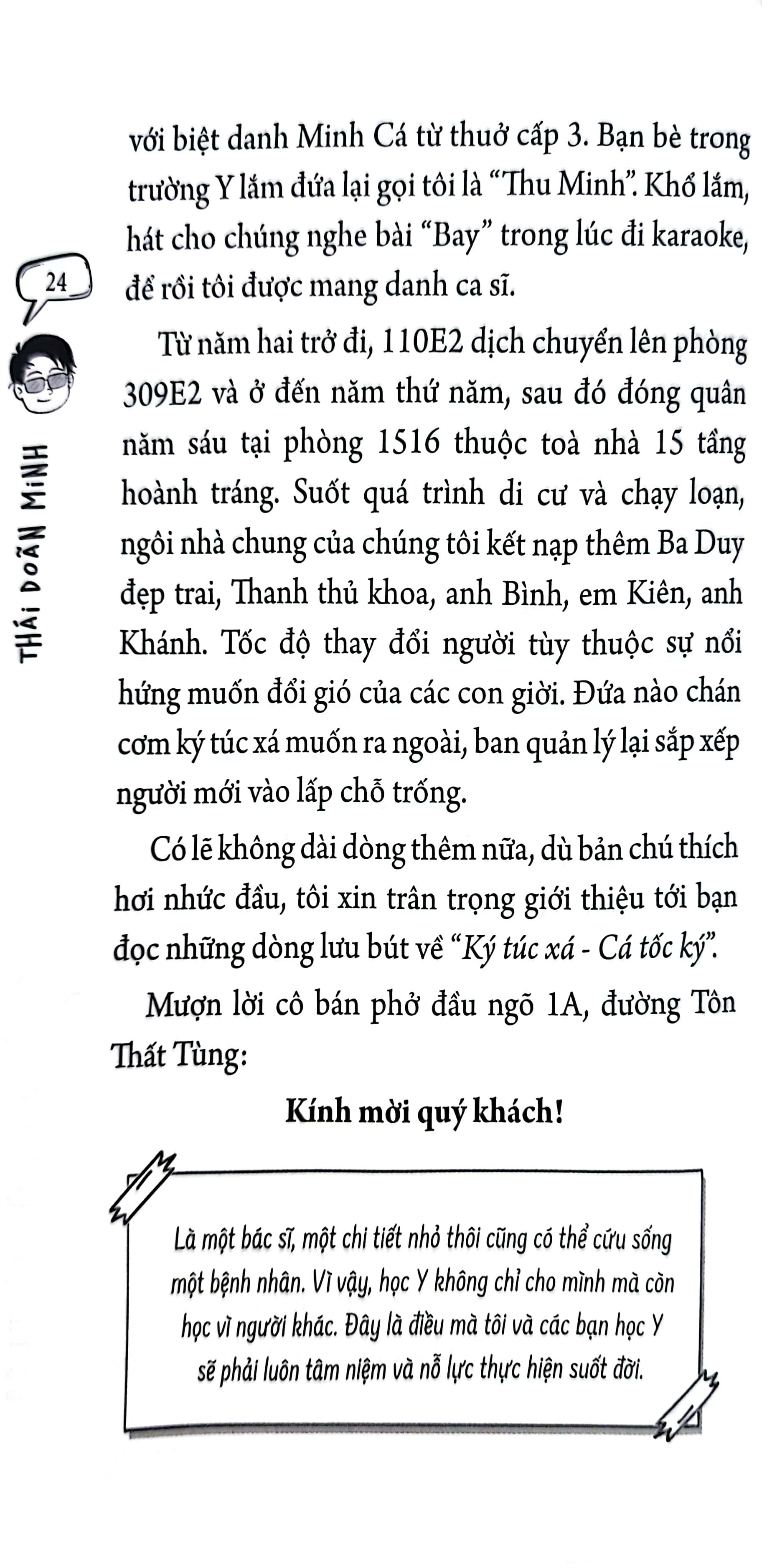 Kể như vậy để thấy ai đã từng là sinh viên mà đặc biệt là sinh viên y khoa đều có những kỷ niệm không thể nào quên, gắn chặt với ký túc xá cùng những người bạn đồng khoá. Chính vì vậy tôi đã rất hào hứng đọc “Ký túc xá - cá tốc ký” ngay buổi chiều hôm được Minh nhờ viết lời giới thiệu. Vậy nhưng không như thông thường, phải gần hai tuần tôi mới “ngốn” được hết quyển sách dày gần 300 trang đầy ắp những chữ này. Có thể do tôi đã già hoặc do cái thời bao cấp của chúng tôi khác nhiều so với bây giờ nên những câu chuyện các bạn kể, những suy nghĩ và hành động của các cô cậu mới ngoài 20 đã khiến tôi vô cùng ngạc nhiên. Năm thứ nhất đã nhận thức được rằng: “Là một bác sĩ, một chi tiết nhỏ thôi cũng có thể cứu sống một bệnh nhân. Vì vậy, học Y không chỉ cho m.ình mà còn học vì người khác. Đây là điều mà tôi và các bạn học Y sẽ phải luôn tâm niệm và nỗ lực thực hiện suốt đời.”