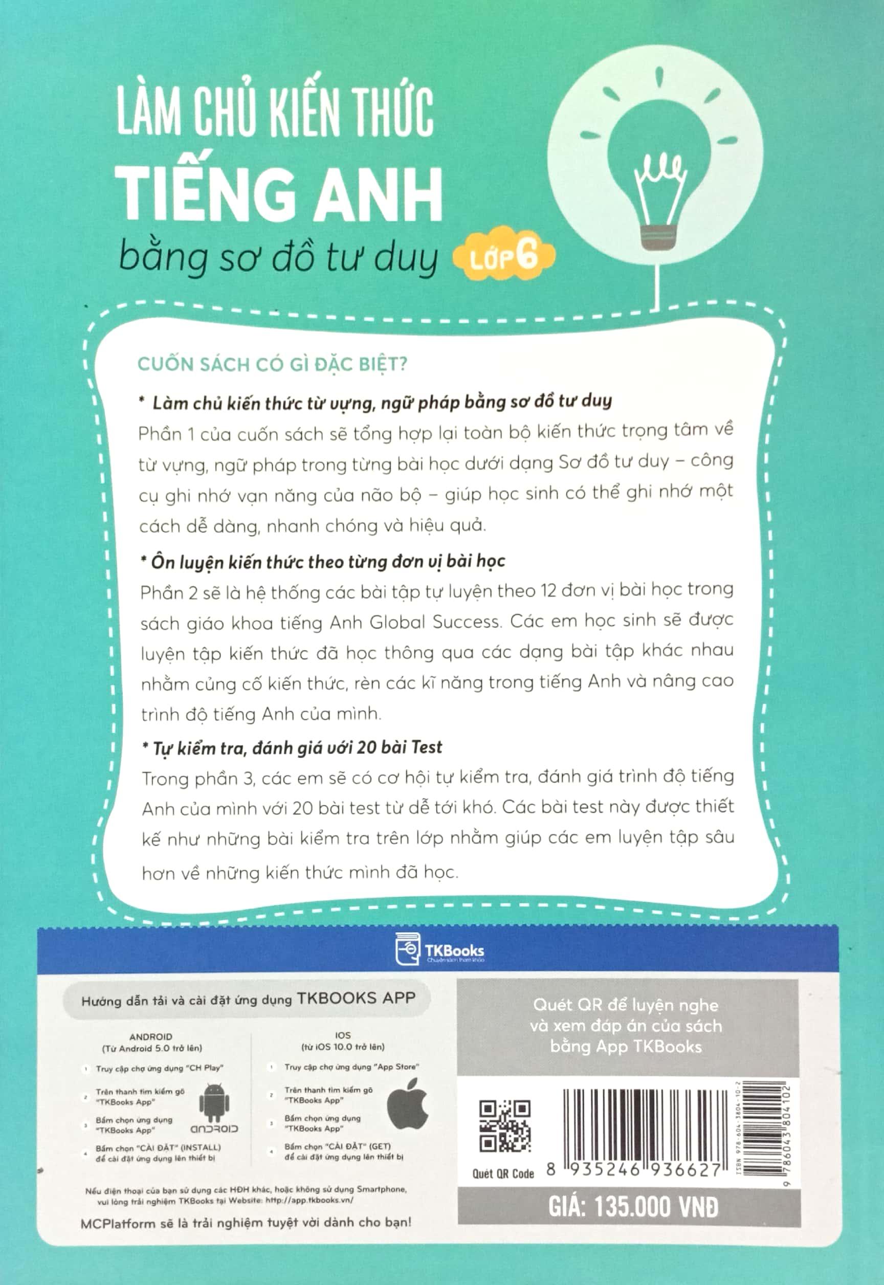 Cuốn sách tổng hợp kiến thức dưới dạng sơ đồ tư duy sinh động, màu sắc bắt mắt và cách trình bày khoa học sẽ giúp các em học sinh nắm vững kiến thức từ vựng, ngữ pháp trọng tâm và rèn kỹ năng làm bài thi hiệu quả theo sách giáo khoa Global Success.
