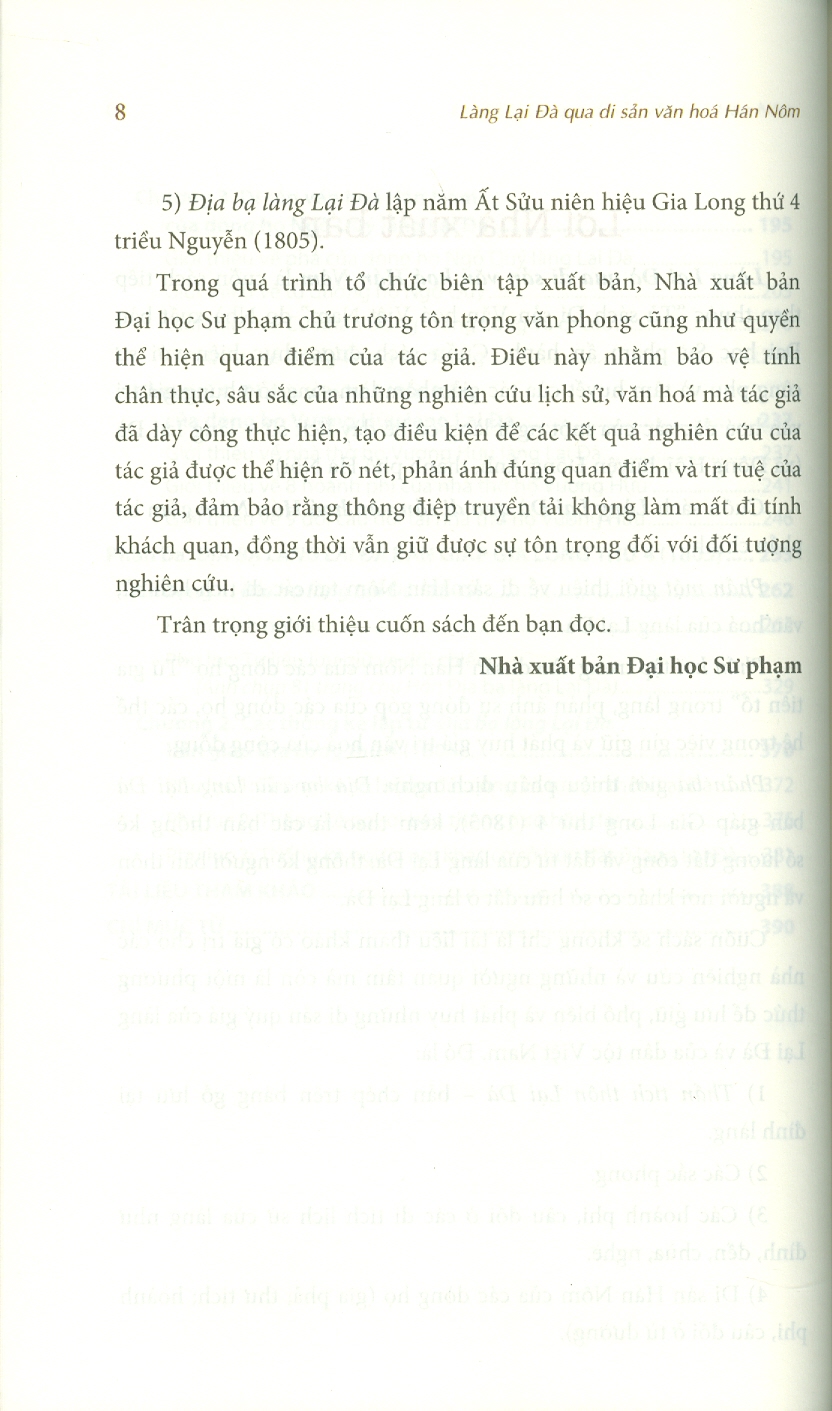 Cuốn sách sẽ không chỉ là tài liệu tham khảo có giá trị cho các nhà nghiên cứu và những người quan tâm mà còn là một phương thức để lưu giữ, phổ biến và phát huy những di sản quý giá không chỉ của làng Lại Đà mà còn là của dân tộc Việt Nam. Đó là: