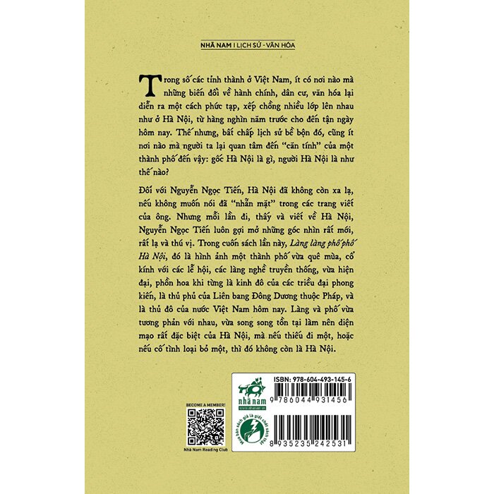 Đối với Nguyễn Ngọc Tiến, Hà Nội đã không còn xa lạ, nếu không muốn nói đã “nhẵn mặt” trong các trang viết của ông. Nhưng mỗi lần đi, thấy và viết về Hà Nội, Nguyễn Ngọc Tiến luôn gợi mở những góc nhìn rất mới, rất lạ và thú vị. Trong cuốn sách lần này, Làng làng phố phố Hà Nội, đó là hình ảnh một thành phố vừa quê mùa, cổ kính với các lễ hội, các làng nghề truyền thống, vừa hiện đại, phồn hoa khi từng là kinh đô của các triều đại phong kiến, là thủ phủ của Liên bang Đông Dương thuộc Pháp, và là thủ đô của nước Việt Nam hôm nay. Làng và phố vừa tương phản với nhau, vừa song song tồn tại làm nên diện mạo rất đặc biệt của Hà Nội, mà nếu thiếu đi một, hoặc nếu cố tình loại bỏ một, thì đó không còn là Hà Nội.