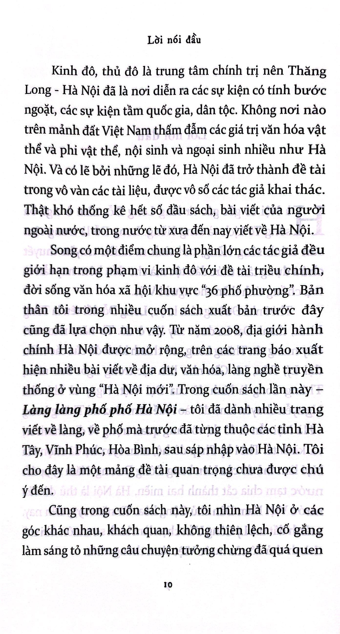 Trong số các tỉnh thành ở Việt Nam, ít có nơi nào mà những biến đổi về hành chính, dân cư, văn hóa lại diễn ra một cách phức tạp, xếp chồng nhiều lớp lên nhau như ở Hà Nội, từ hàng nghìn năm trước cho đến tận ngày hôm nay. Thế nhưng, bất chấp lịch sử bề bộn đó, cũng ít nơi nào mà người ta lại quan tâm đến "căn tính" của một thành phố đến vậy: gốc Hà Nội là gì, người Hà Nội là như thế nào? Đối với Nguyễn Ngọc Tiến, Hà Nội đã không còn xa lạ, nếu không muốn nói đã "nhẵn mặt" trong các trang viết của ông. Nhưng mỗi lần đi, thấy và viết về Hà Nội, Nguyễn Ngọc Tiến luôn gợi mở những góc nhin rất mới, rất lạ và thú vị. Trong cuốn sách lần này, Làng làng phố phố Hà Nội, đó là hình ảnh một thành phố vừa quê mùa, cổ kính với các lễ hội, các làng nghề truyền thống, vừa hiện đại, phồn hoa khi từng là kinh đô của các triều đại phong kiến, là thủ phủ của Liên bang Đông dương thuôc Pháp, và là thủ đô của nước Việt Nam hôm nay. Làng và phố vừa tương phản với nhau, song song tồn tại làm nên diện mạo rất đặc biệt của Hà Nội, mà nếu thiếu đi một, hoặc nếu cố tình loại bổ một, thì đó không còn là Hà Nội.