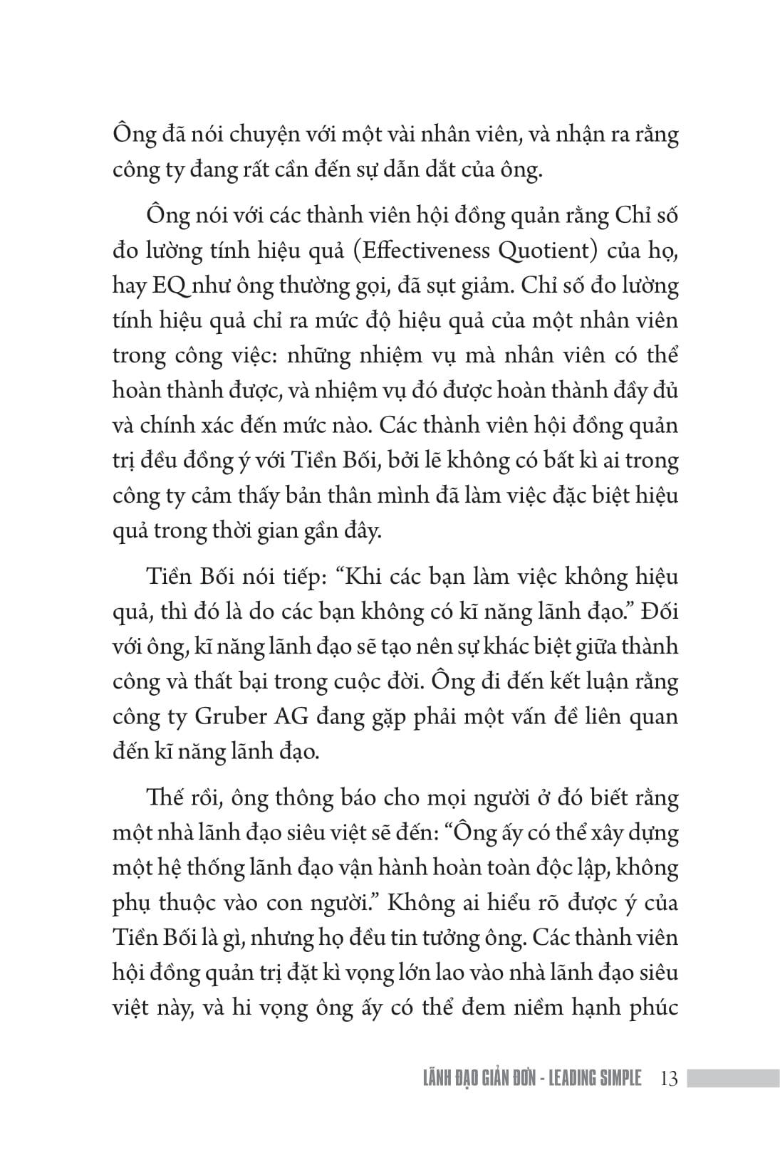 Mua tại TiktokTrong câu chuyện sau đây, phần lớn tên của các nhân vật và địa điểm đã được thay đổi. Việc này nhằm thể hiện sự tôn trọng dành cho những người mong muốn được giữ kín danh tính của mình. Hệ thống Leading Simple (Lãnh đạo Giản đơn) được thể hiện bởi việc lãnh đạo bằng cái đầu, đôi tay và con tim. Những biểu tượng này nhắc nhở chúng ta phải luôn suy xét đến cả 3 yếu tố tạo ra hiệu quả trong việc lãnh đạo. Những nhiệm vụ đại diện cho cái đầu (làm gì?) Những công cụ đại diện cho đôi tay (bằng công cụ gì?) và Những nguyên tắc đại diện cho trái tim (làm như thế nào và tại sao?) "Khả năng lãnh đạo làm nên sự khác biệt giữa thành công và thất bại: sự khác biệt giữa một cuộc sống viên mãn và những điều tầm thường đầy chán nản."