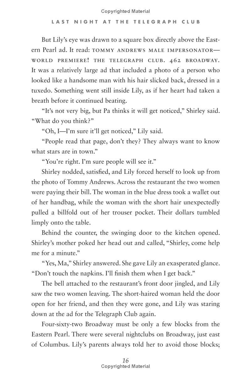 Seventeen-year-old Lily Hu can't remember exactly when the feeling took root—that desire to look, to move closer, to touch. Whenever it started growing, it definitely bloomed the moment she and Kathleen Miller walked under the flashing neon sign of a lesbian bar called the Telegraph Club. Suddenly everything seemed possible.