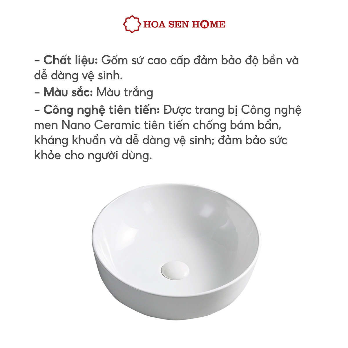 - Màu sắc: Trắng - Tráng men công nghệ cao, chống bám bẩn, lau rửa dễ dàng - Có thể lắp đặt trên bàn đá, tủ lavabo. - Chất liệu sứ cao cấp với lớp men