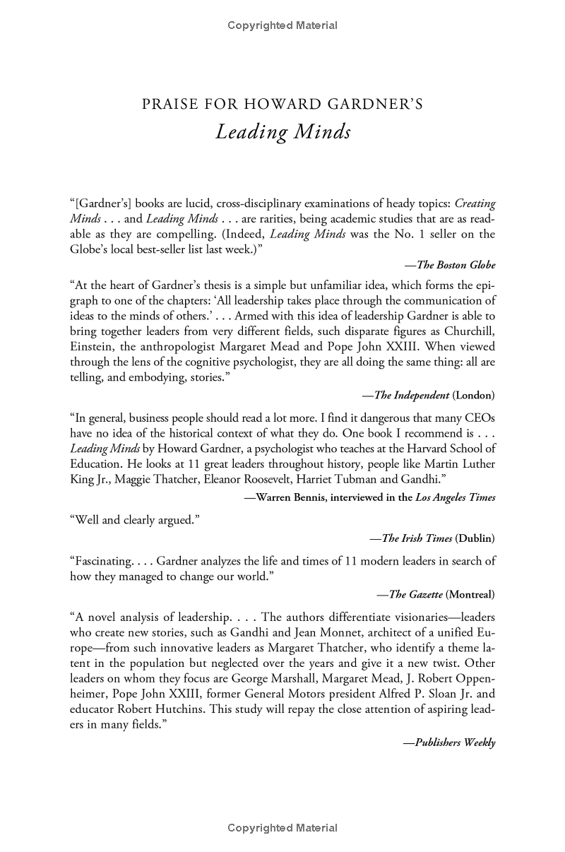 In Leading Minds , Gardner and his research associate at Harvard Project Zero, Emma Laskin, apply a cognitive lens to leadership, drawing on Gardner's ground-breaking work on intelligence and creativity to offer fascinating revelations about the minds of leaders and those who follow them. This reissue includes a new introduction by the author.